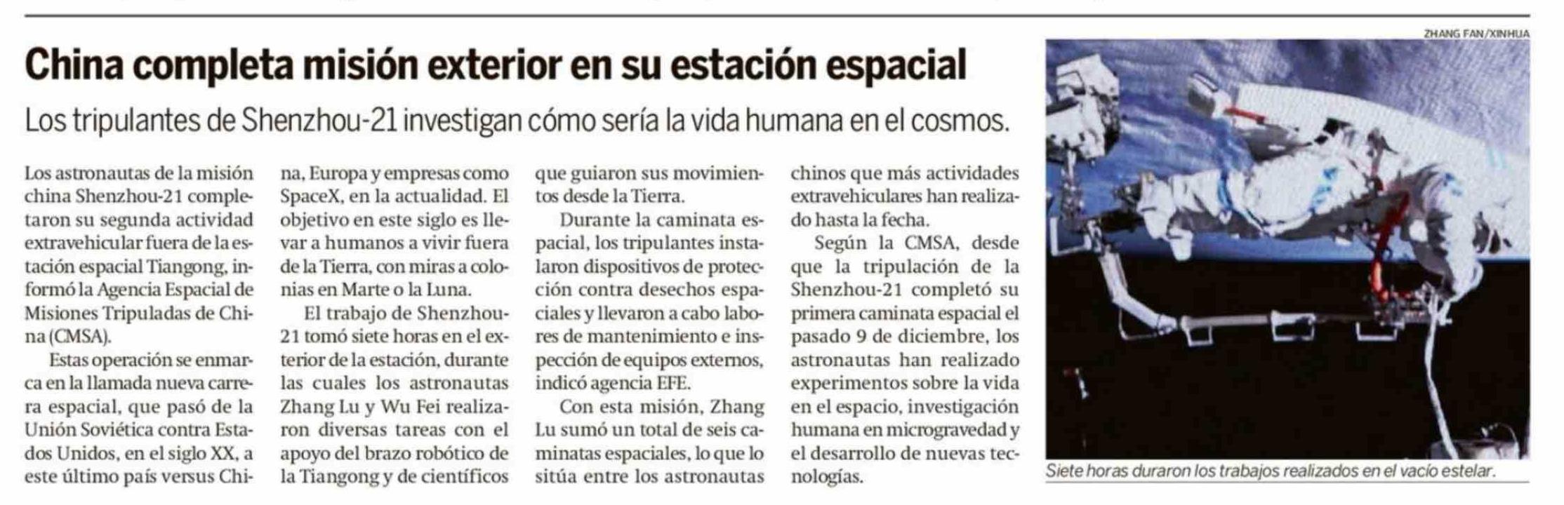 China completa mision exterior en su estación espacial