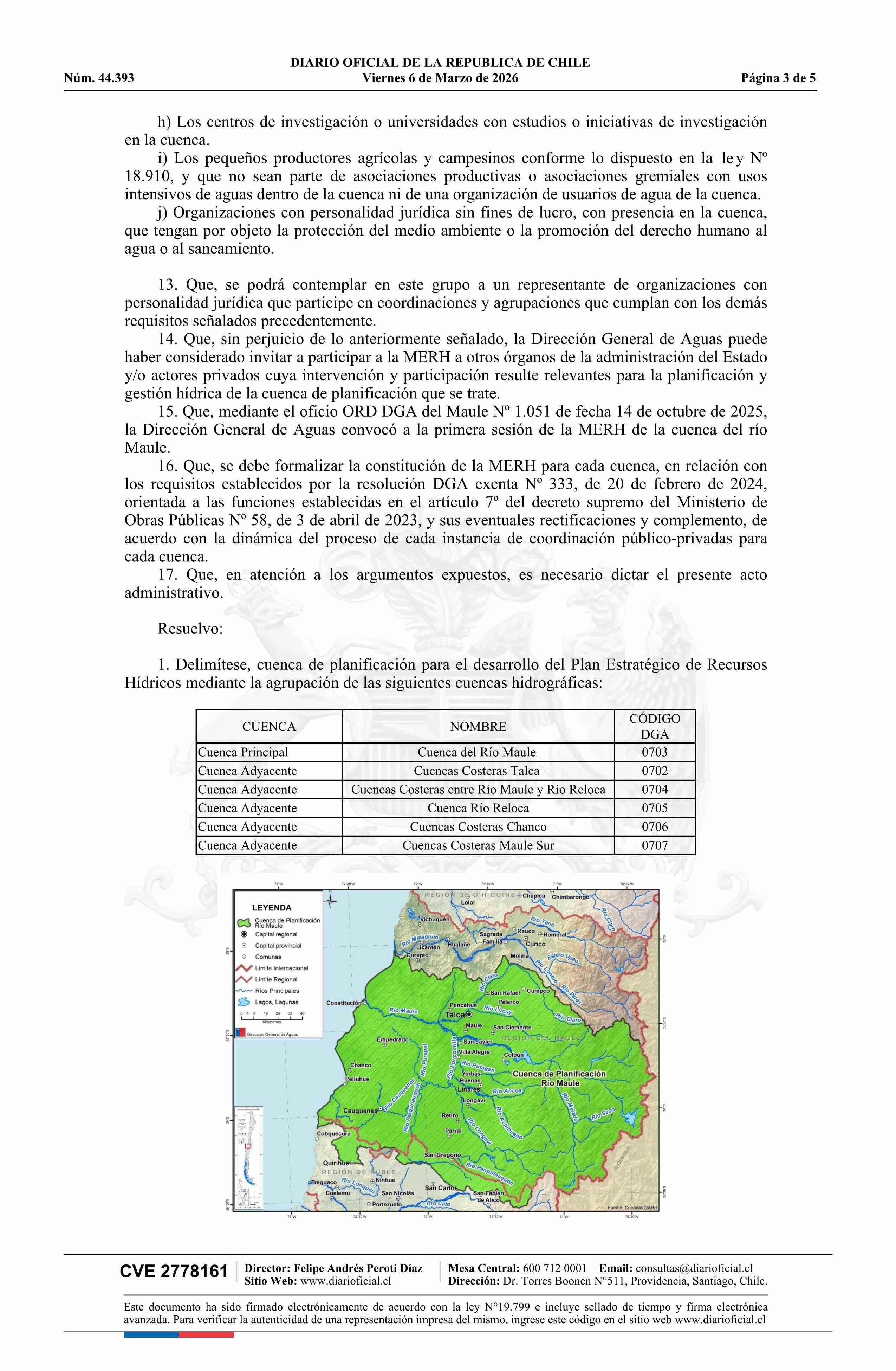 Título: Resolución exenta número 430, de 2026.- Delimita y denomina cuenca de planificación para el desarrollo del Plan Estratégico de Recursos Hídricos en la Cuenca del Río Maule y Adyacentes; constituye mesa estratégica de recursos hídricos; identifica convocados y asistencia a primera sesión; y designa d
