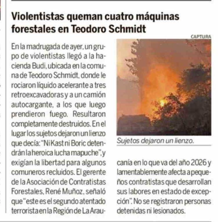 Violentistas queman cuatro máquinas forestales en Teodoro Schmidt