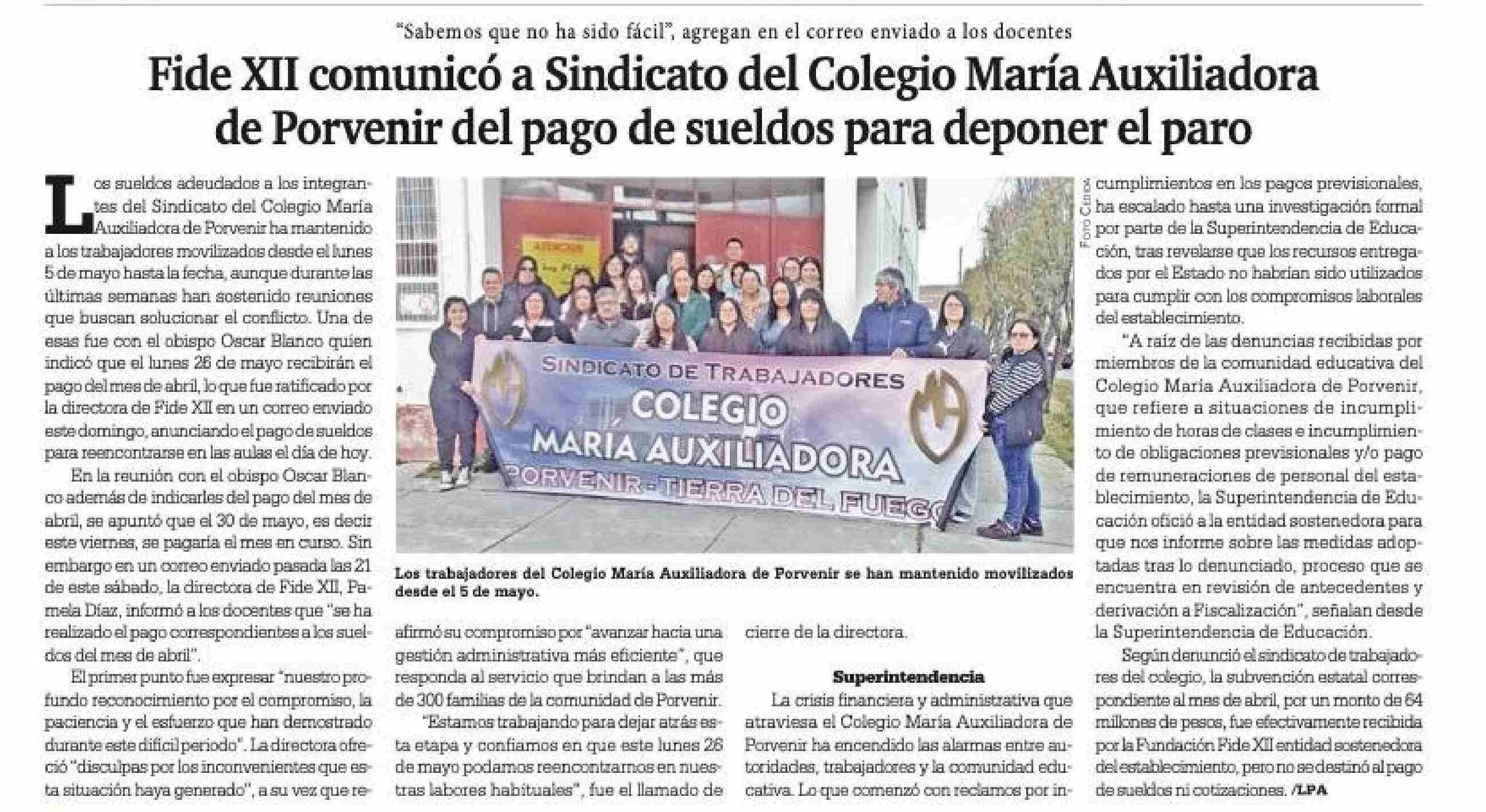 Fide XII comunicó a Sindicato del Colegio María Auxiliadora de Porvenir del pago de sueldos para deponer el paro