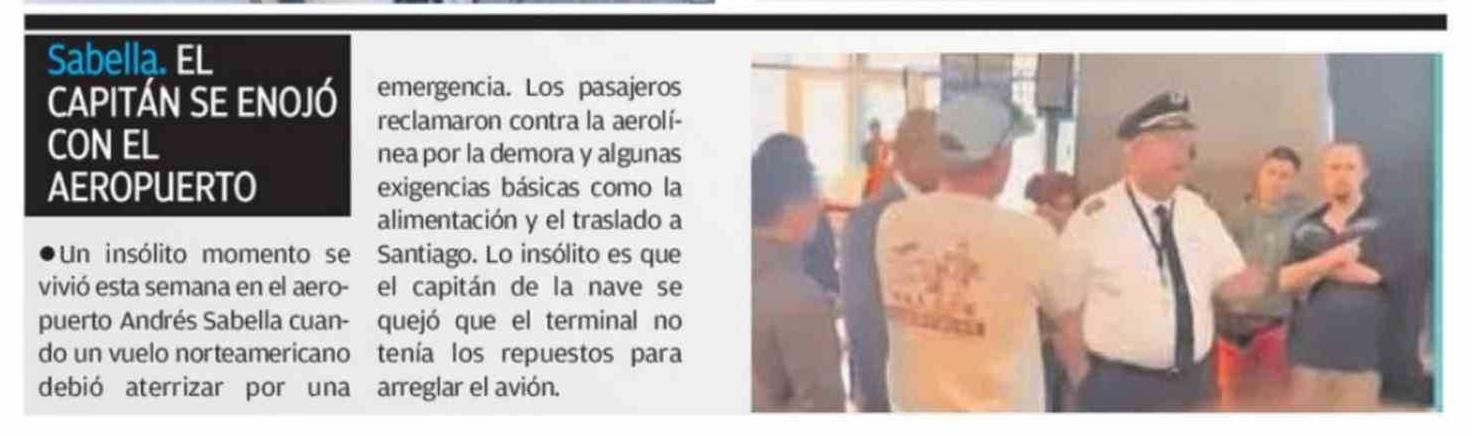 | Título: | Sabella. EL CAPITÁN SE ENOJÓ CON EL AEROPUERTO emergencia. Los pasajeros reclamaron contra la aerolínea por la demora y algunas exigencias básicas como la alimentación y el traslado a Santiago. Lo insólito es que el capitán de la nave se quejó que el terminal no tenía los repuestos para · Un insólit |