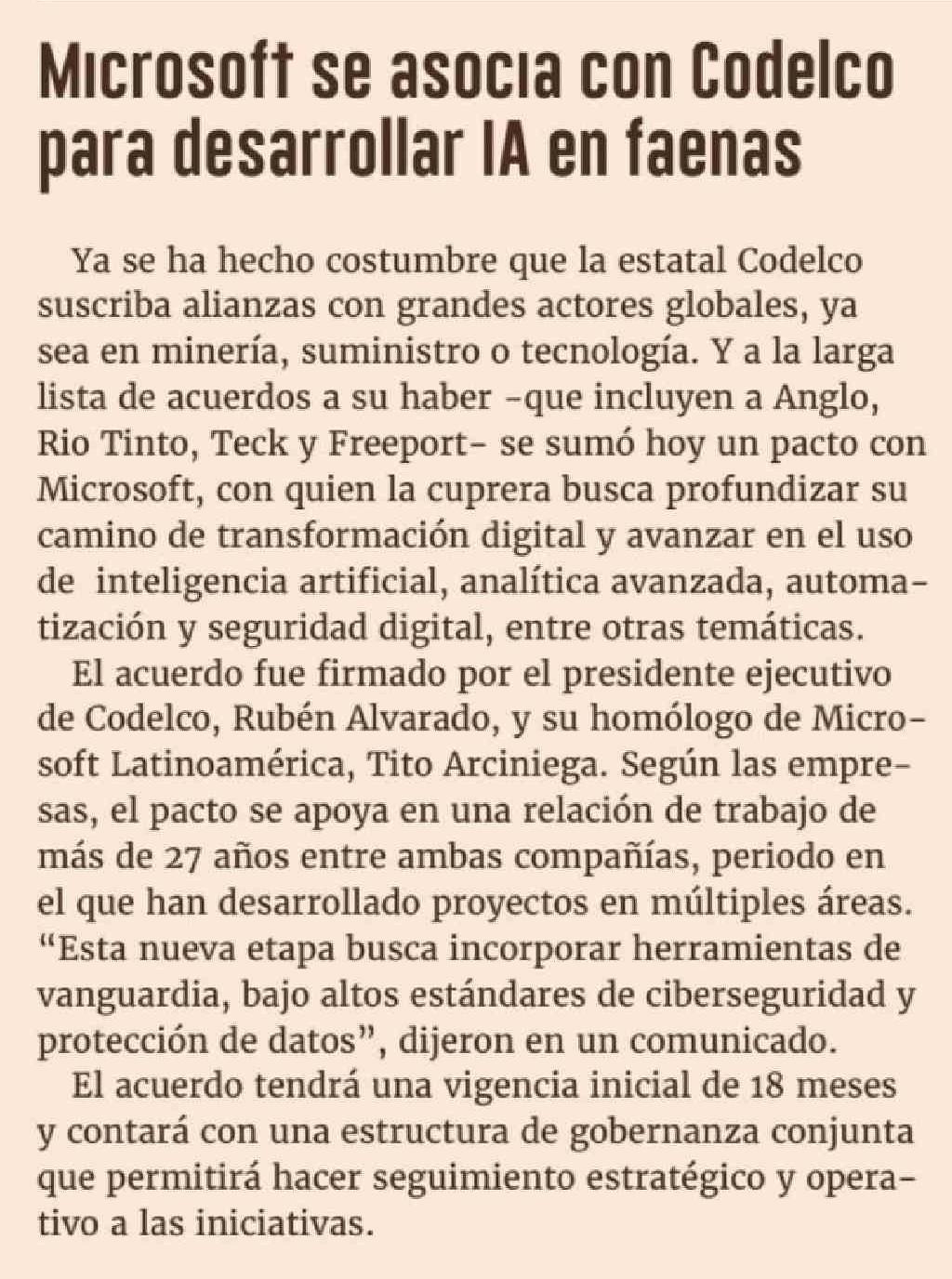 Microsoft se asocia con Codelco para desarrollar IA en faenas