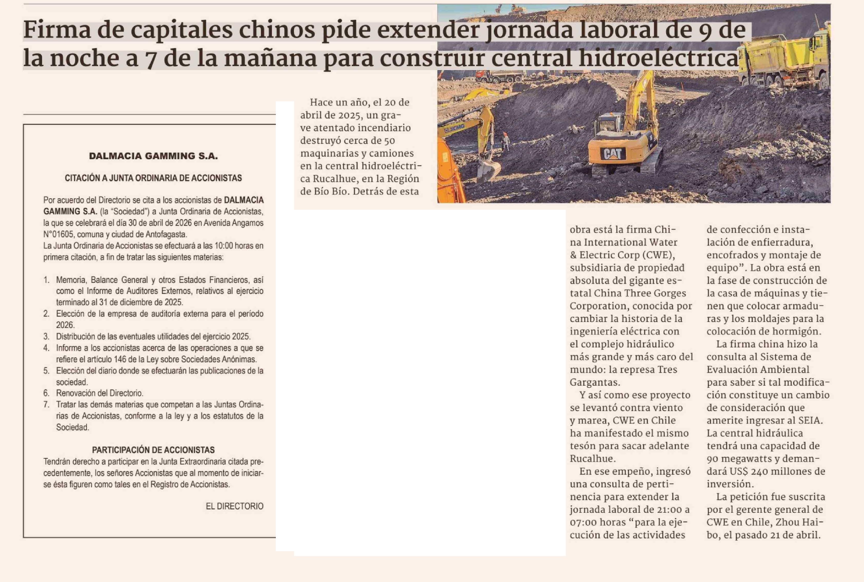 Título: Firma de capitales chinos pide extender jornada laboral de 9 de la noche a 7 de la mañana para construir central hidroeléctrica