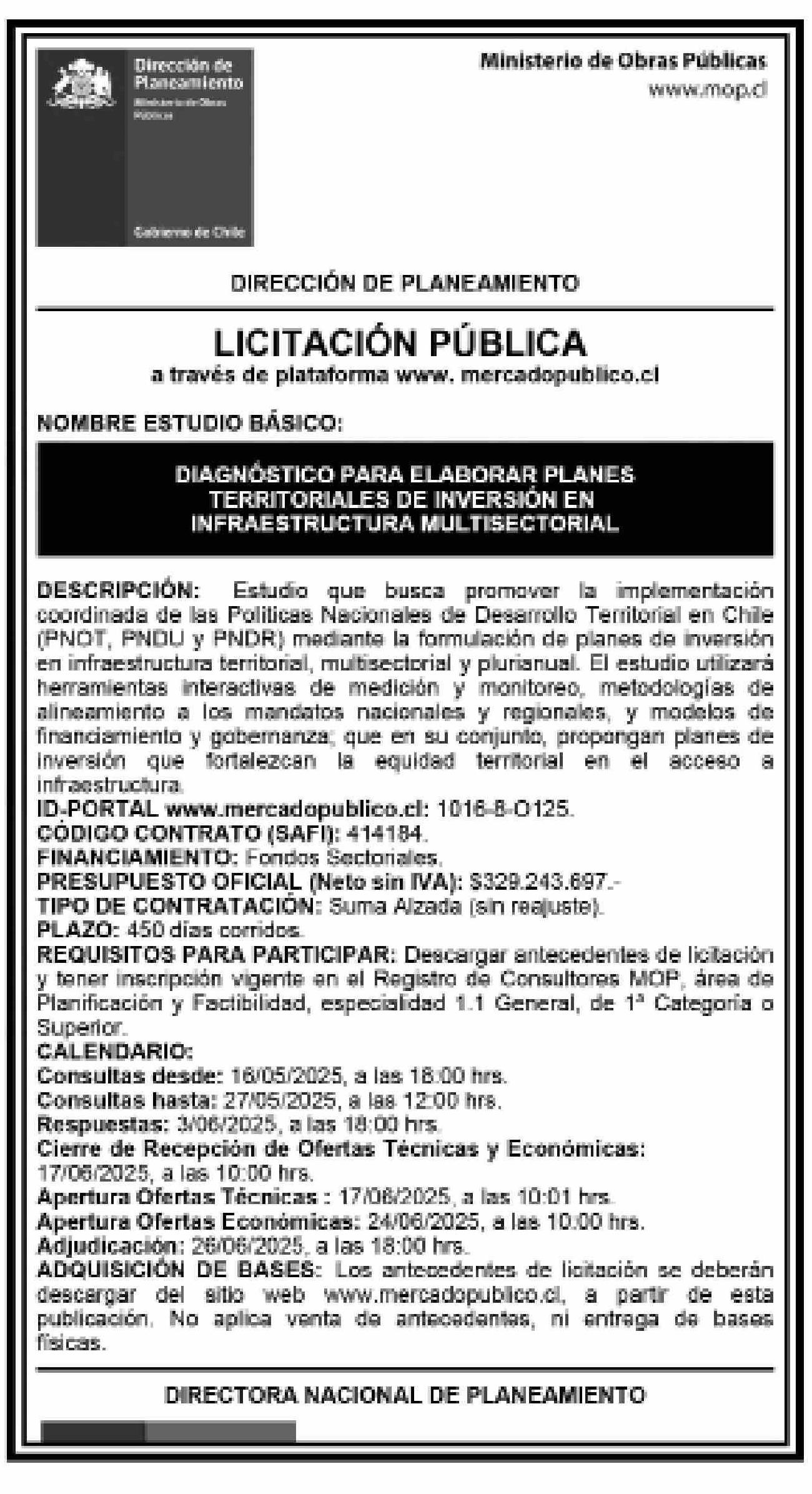 AVISO LICITACIONES: DIAGNÓSTICO PARA IS RRITORIALES DE INVERSIÓN EN INFRAESTRUCTURA MULTISECTORIAL - MOP