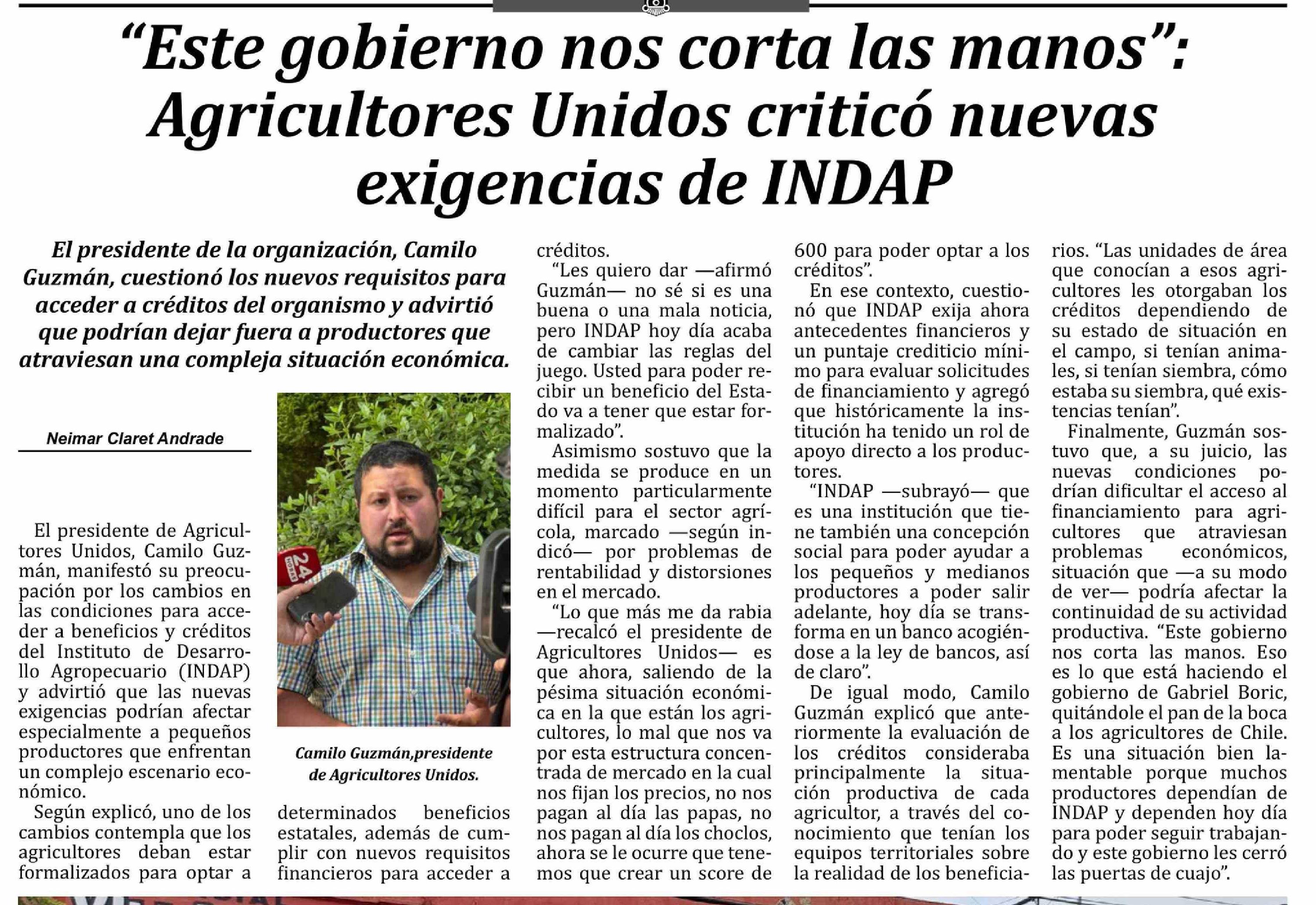 Título: "Este gobierno nos corta las manos": Agricultores Unidos criticó nuevas exigencias de INDAP