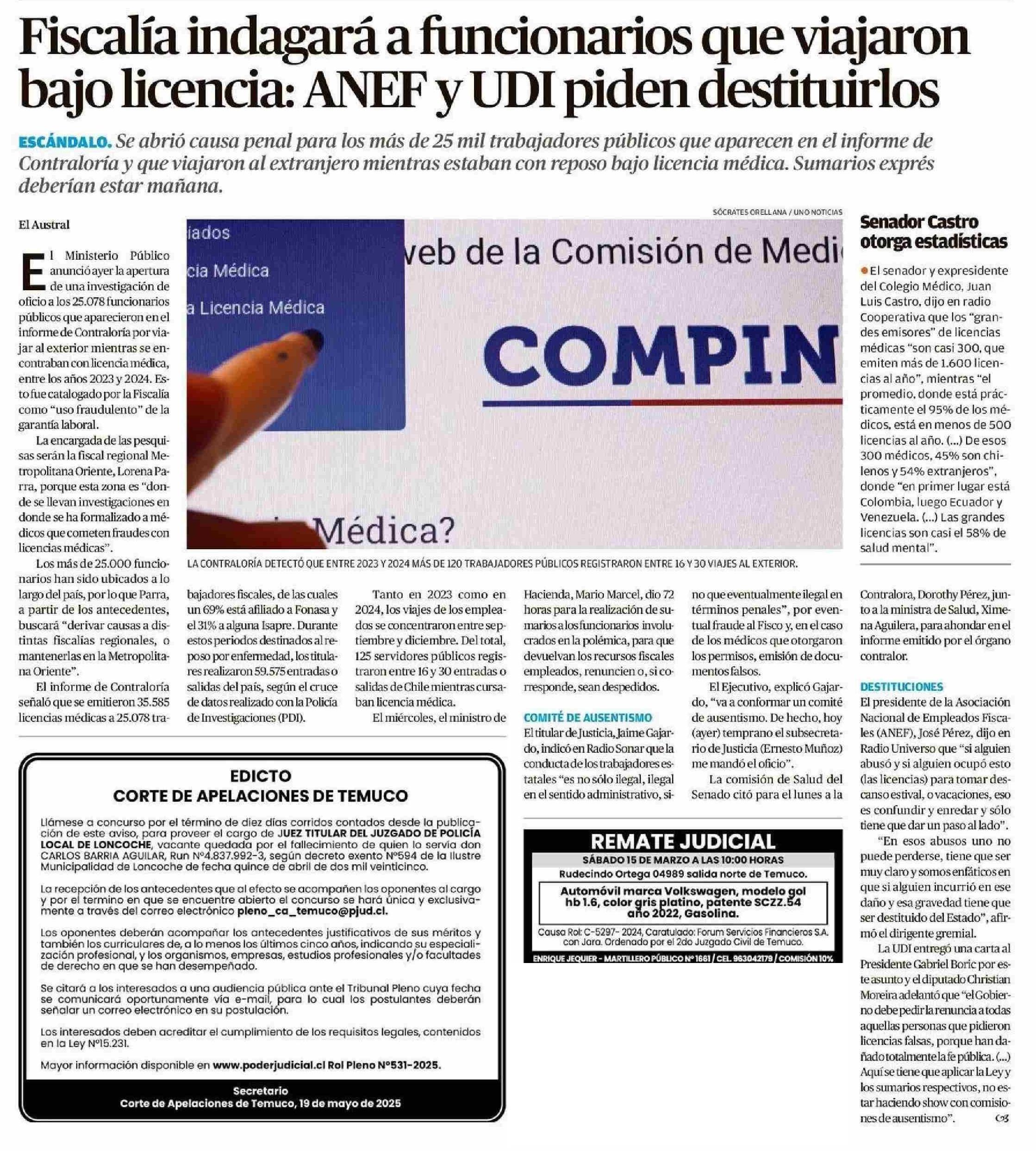 Fiscalía indagará a funcionarios que viajaron bajo licencia: ANEF y UDI piden destituirlos