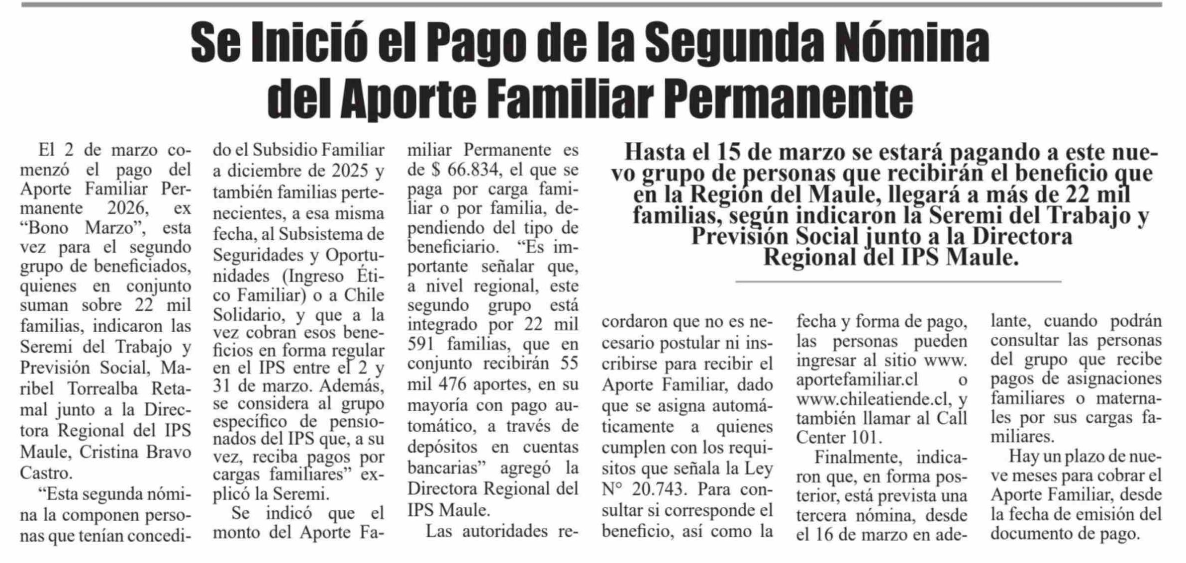 Se Inició el Pago de la Segunda Nómina del Aporte Familiar Permanente