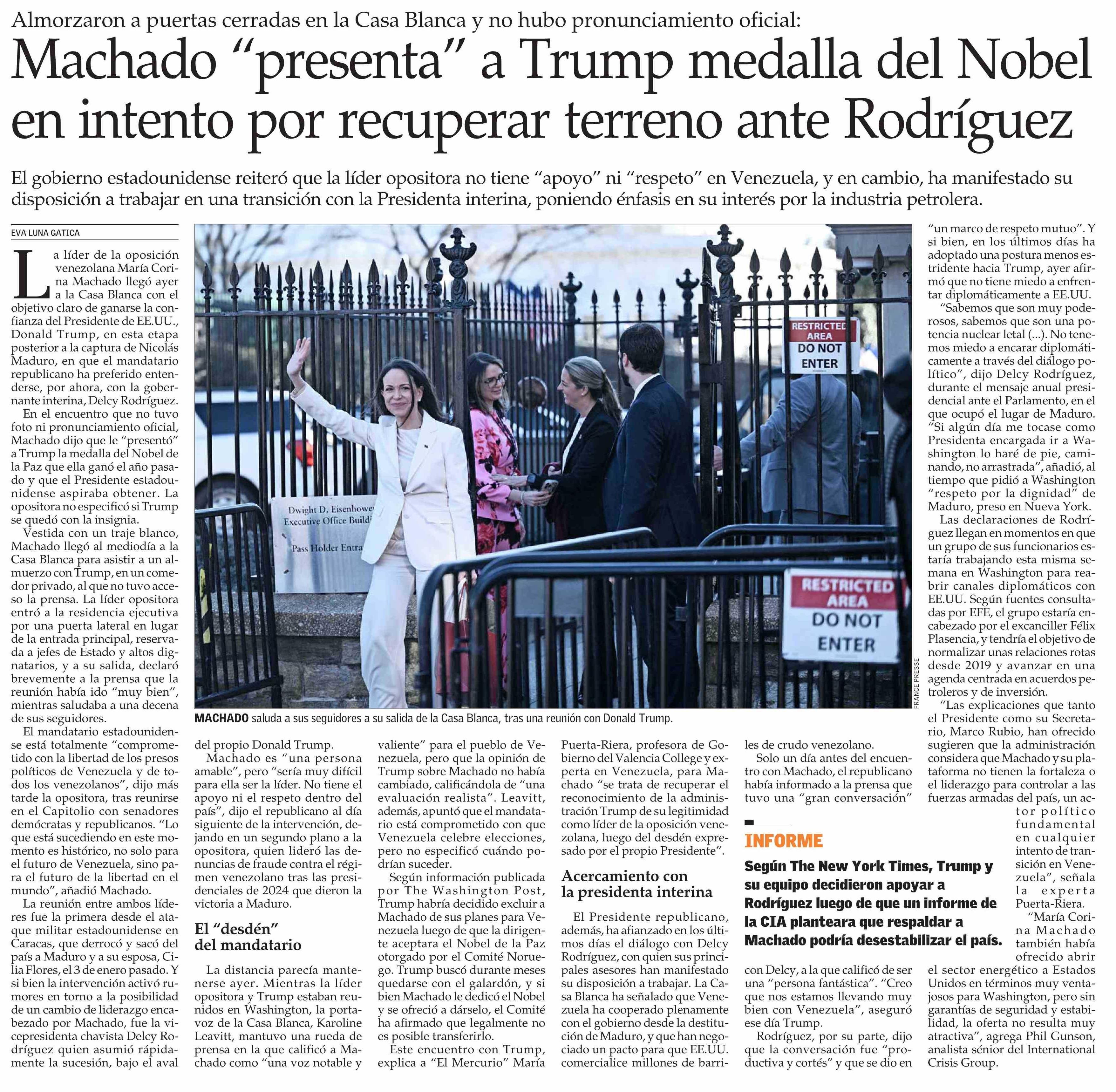 Machado “presenta” a Trump medalla del Nobel en intento por recuperar terreno ante Rodríguez