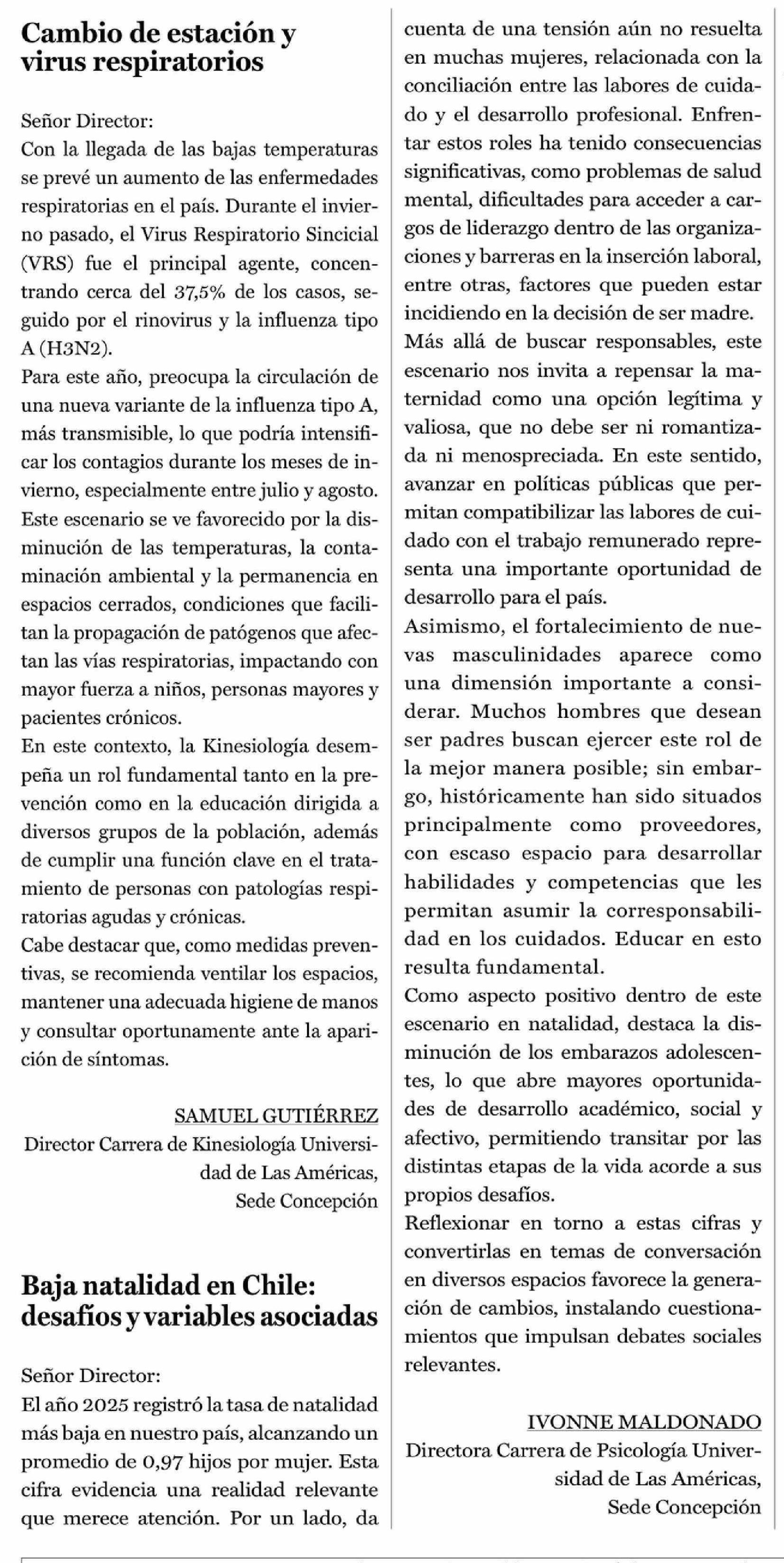 Título: Cartas: Baja natalidad en Chile: desafíos y variables asociadas