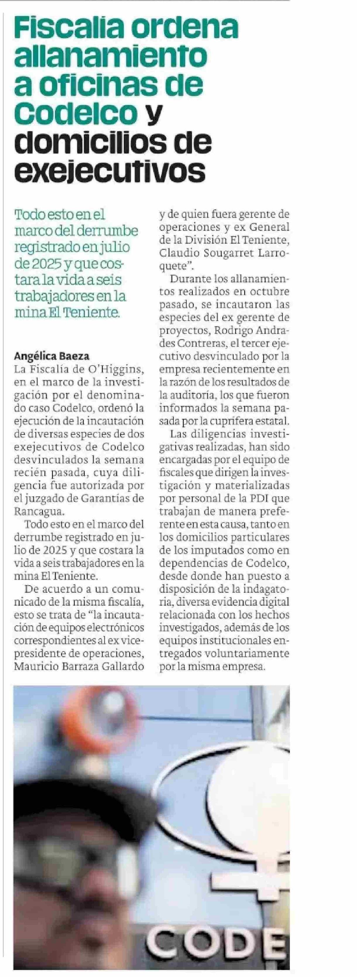 Fiscalia ordena allanamiento a oficinas de Codelco y domicilios de exejecutfivos