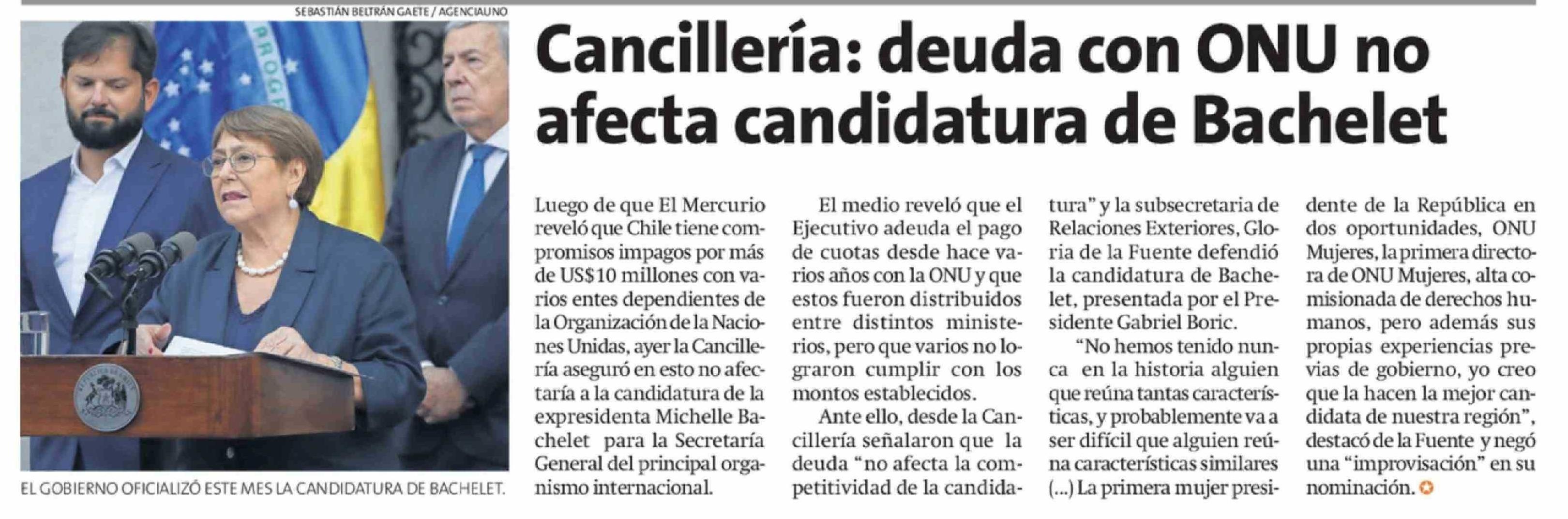 Cancillería: deuda con ONU no afecta candidatura de Bachelet