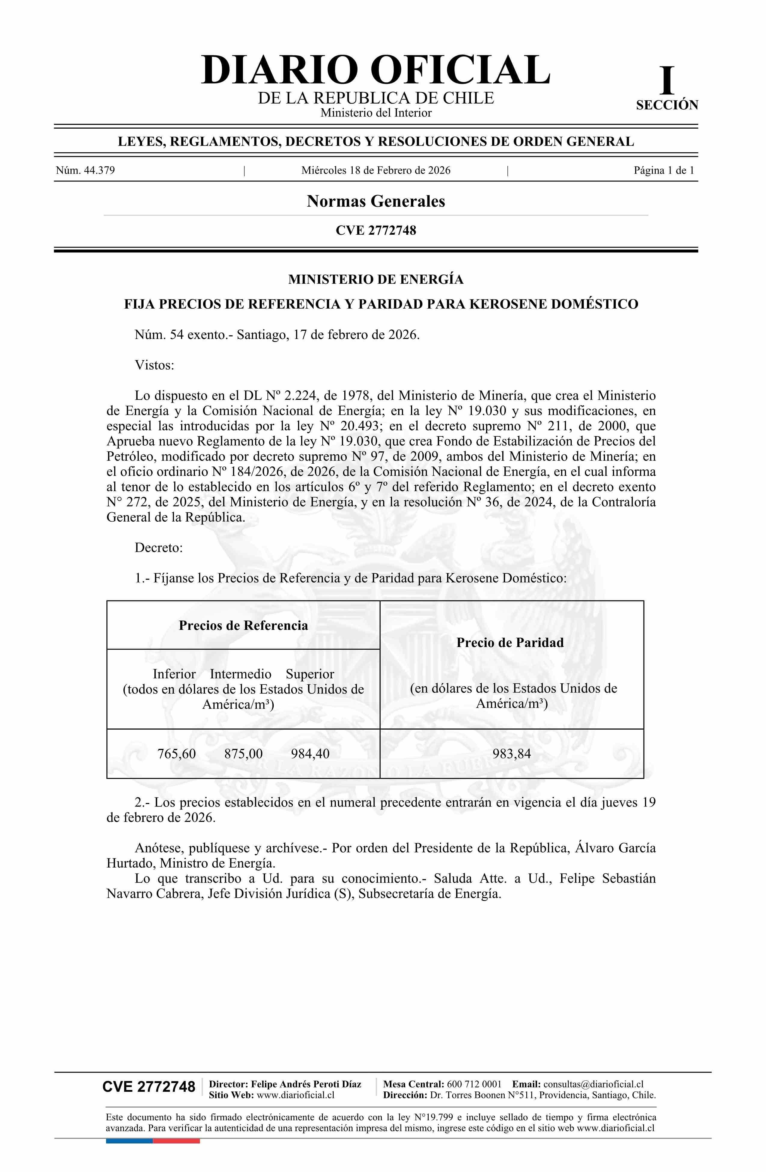 | Título: | Decreto exento número 54, de 2026.- Fija precios de referencia y paridad para kerosene doméstico |