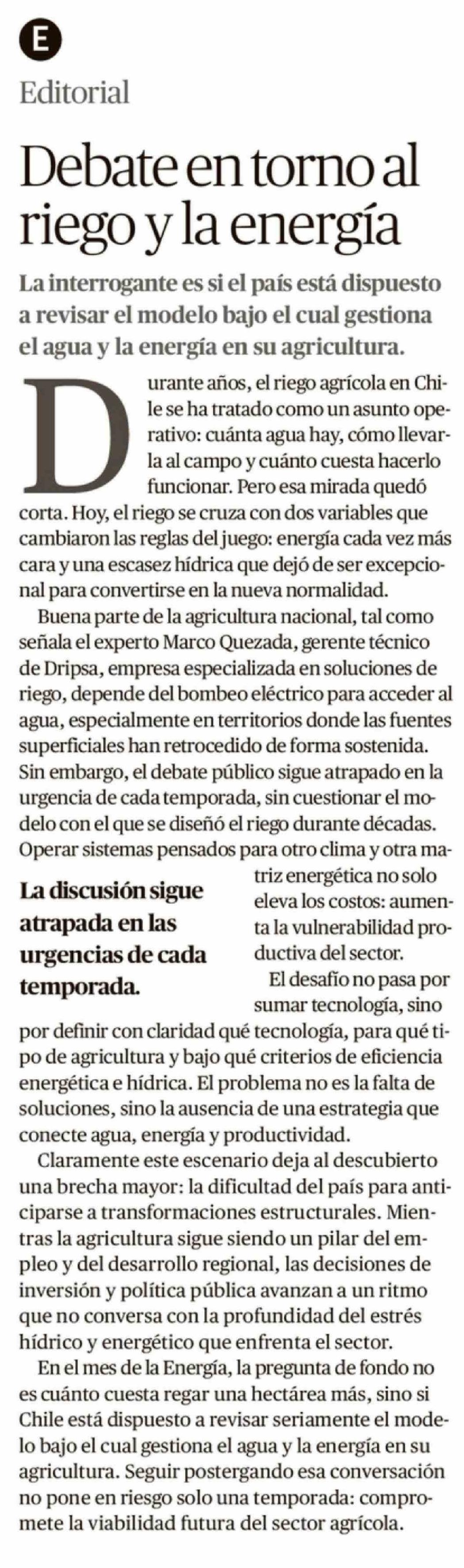 Editorial: Debate en torno al riego y la energía