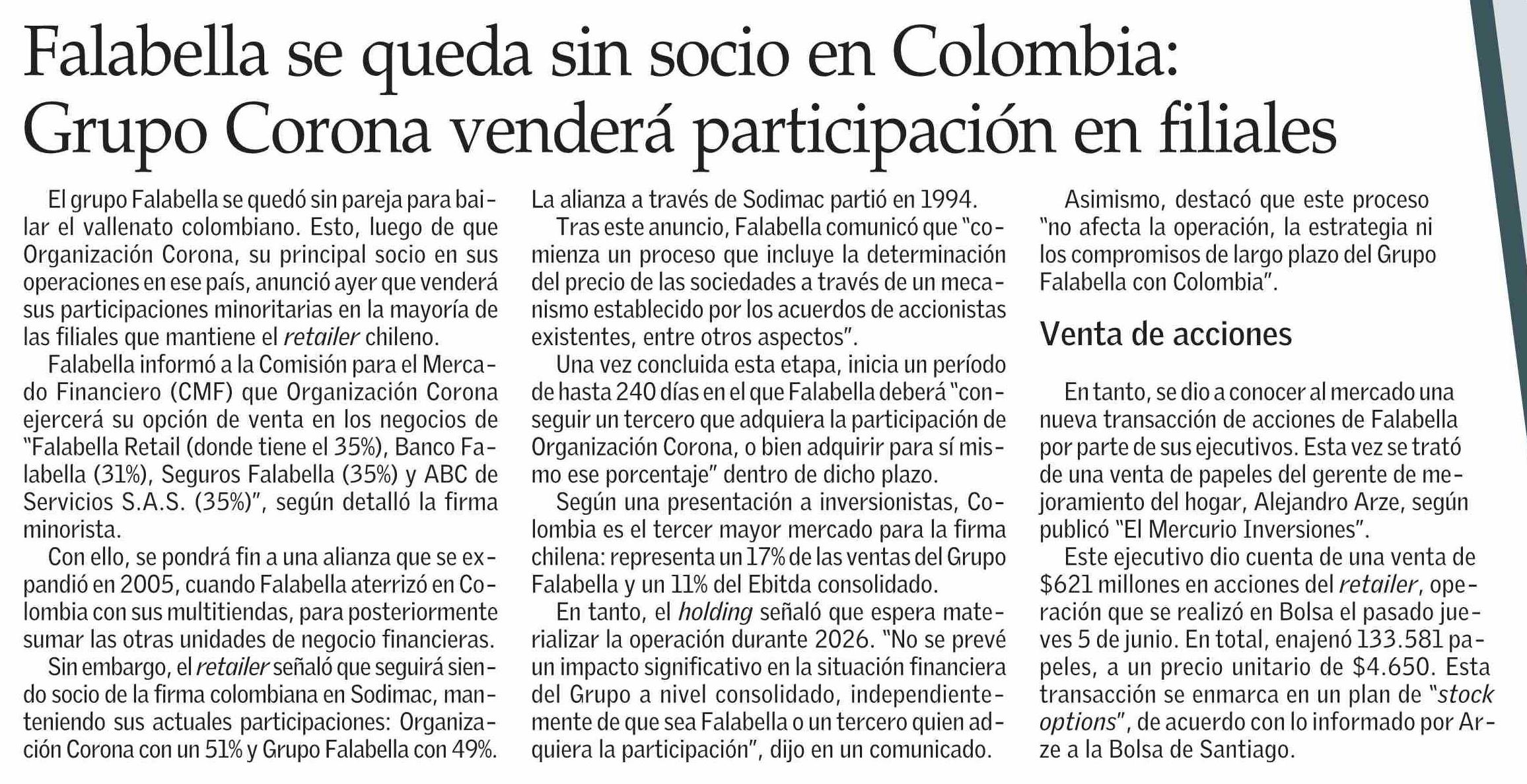 Falabella se queda sin socio en Colombia: Grupo Corona venderá participación en filiales