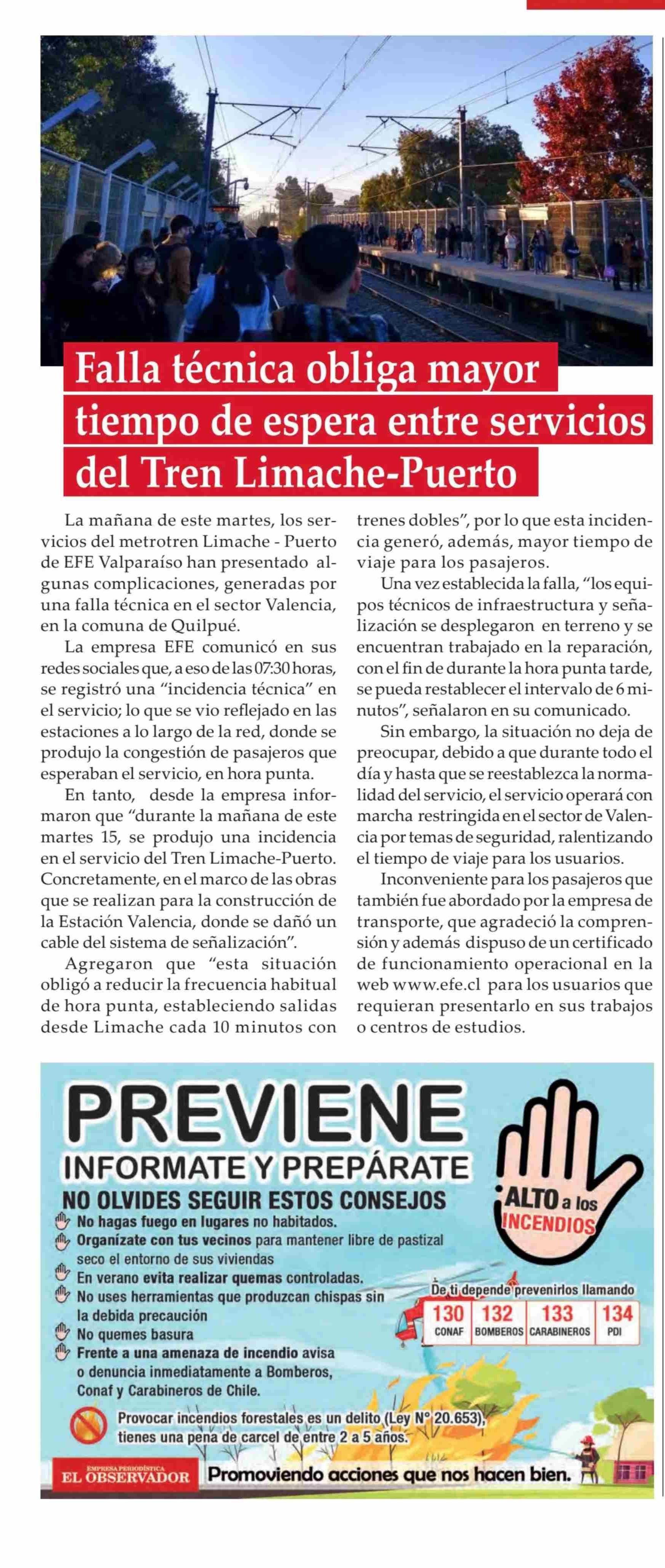 Falla técnica obliamaror tiempo de espera entre servicios del Tren Limache-Puerto