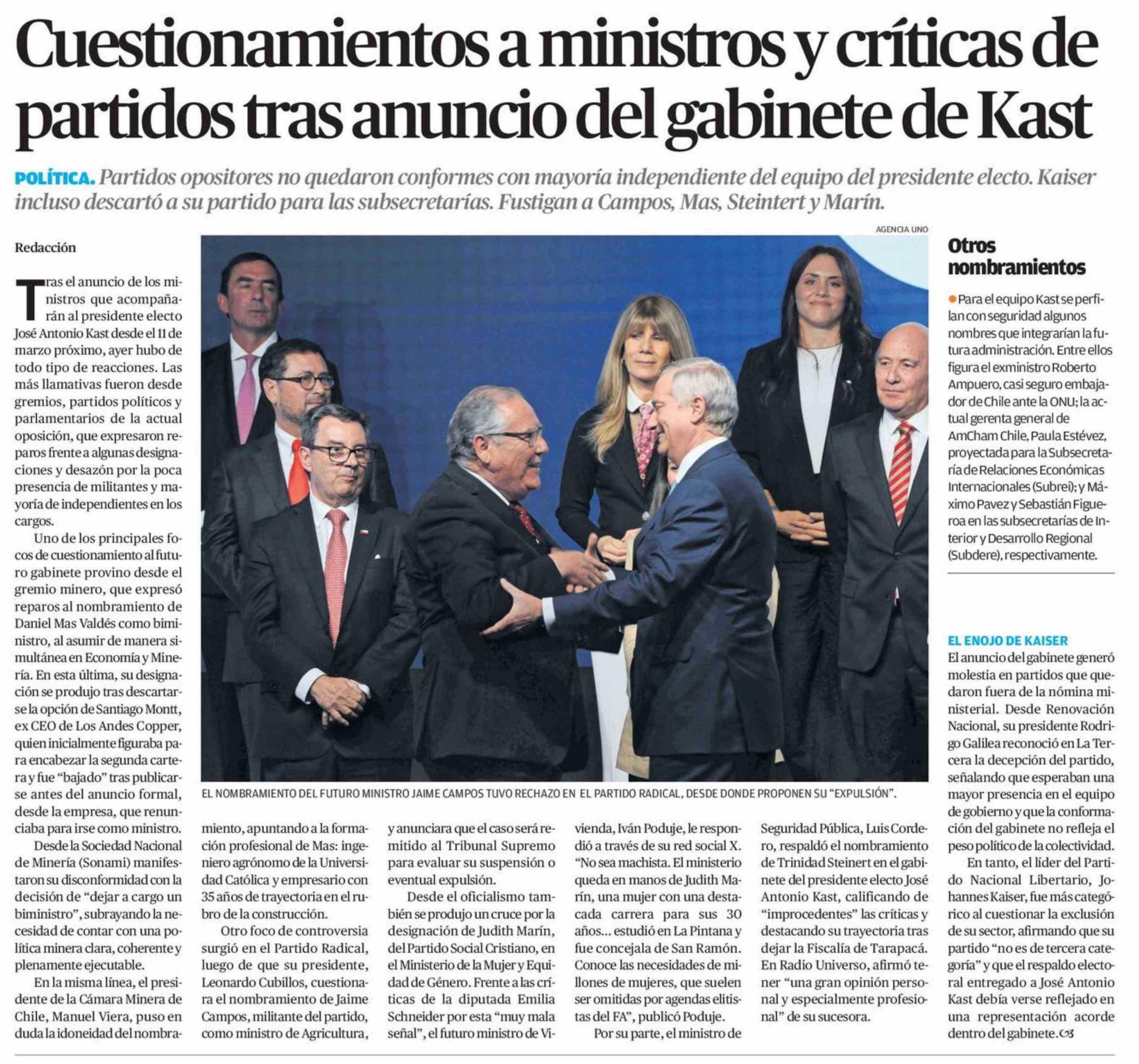 Cuestionamientos a ministros y críticas de partidos tras anuncio del gabinete de Kast