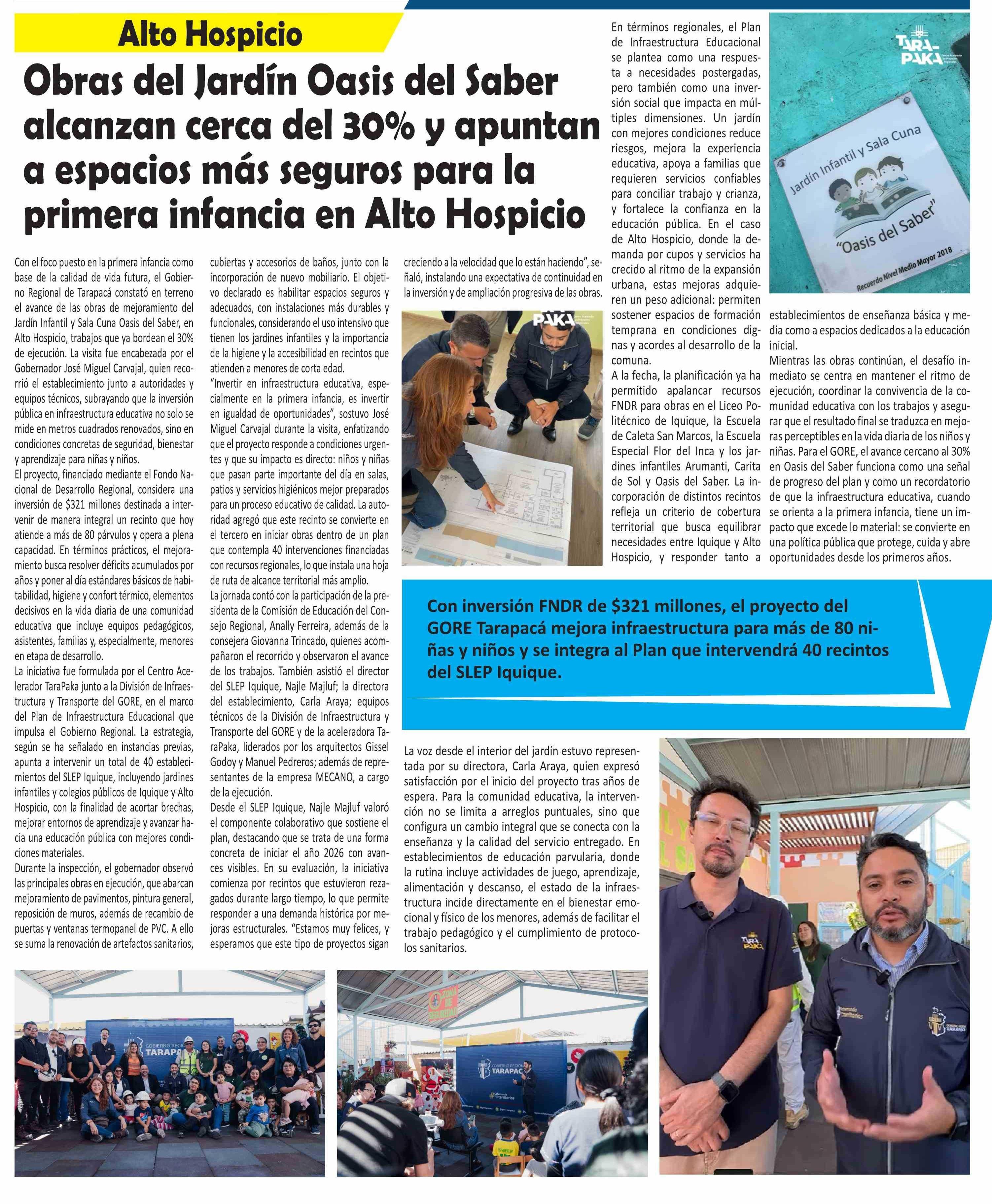 Obras del Jardín Oasis del Saber alcanzan cerca del 30% y apuntan a espacios más seguros para la primera infancia en Alto Hospicio