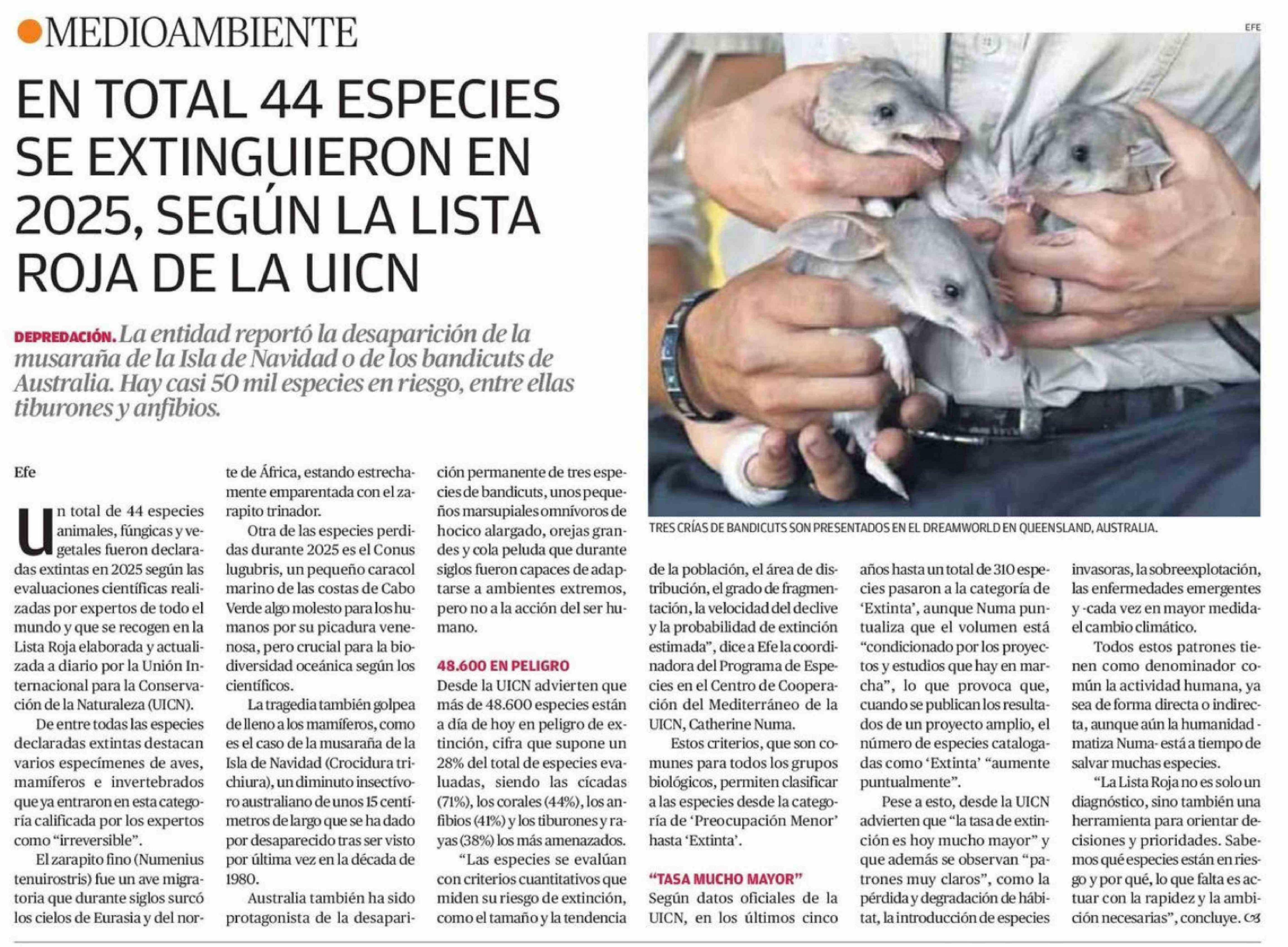 EN TOTAL 44 ESPECIES SE EXTINGUIERON EN 2025, SEGÚN LA LISTA ROJA DE LA UICN
