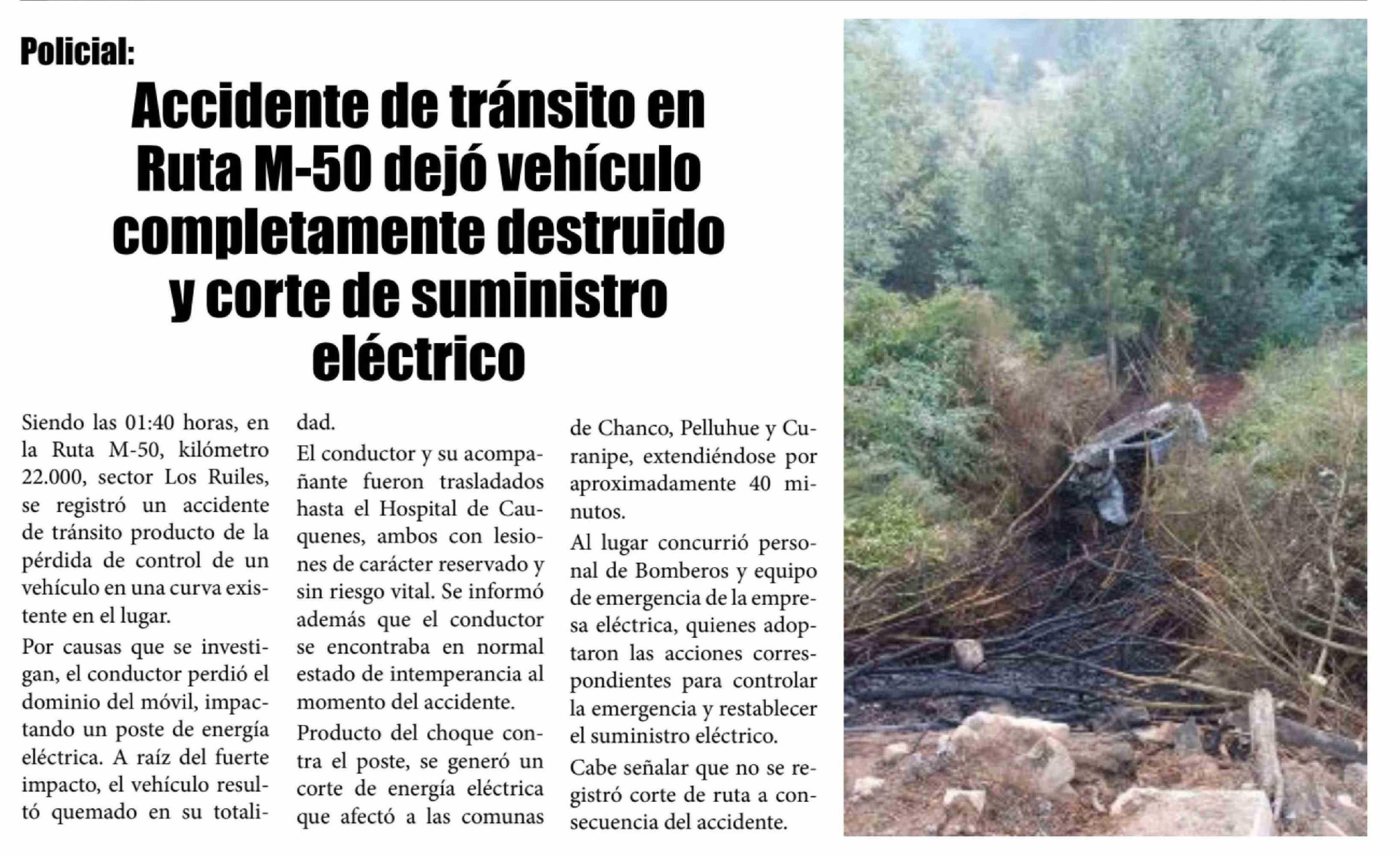 Accidente de tránsito en Ruta M-50 dejó vehículo completamente destruido y corte de suministro eléctrico