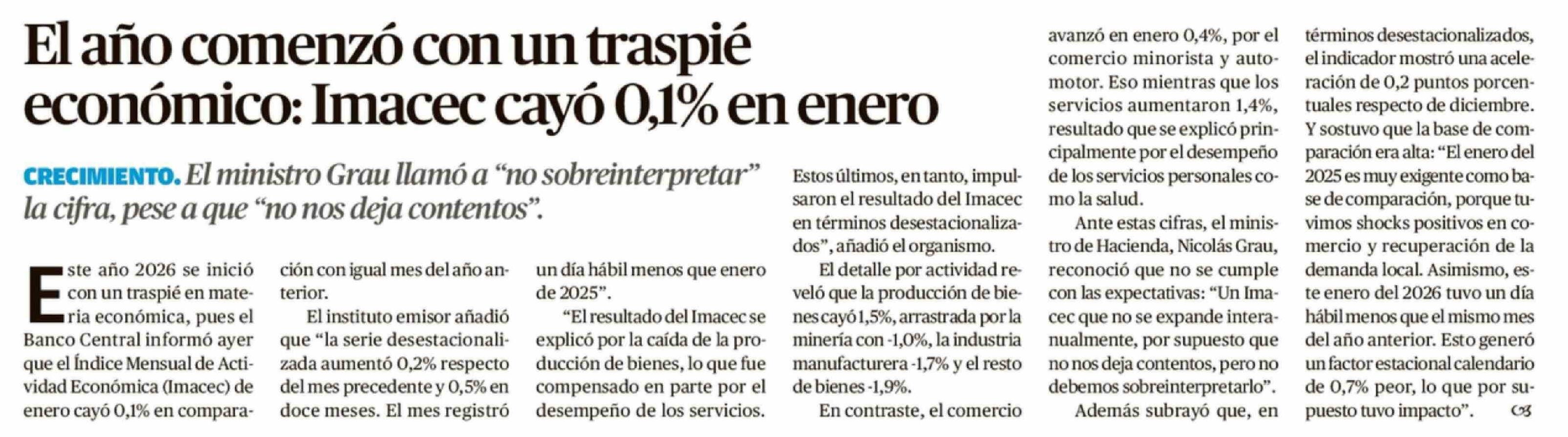 El año comenzó con un traspié económico: Imacec cayó 0,1% en enero