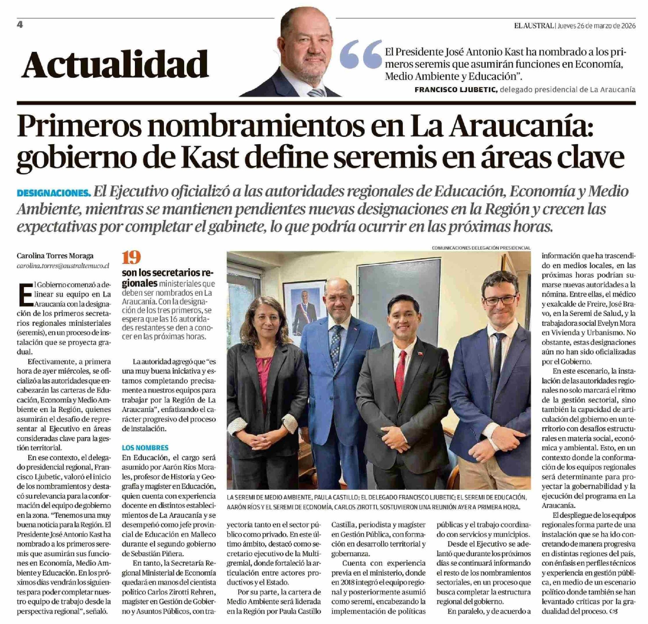 Primeros nombramientos en La Araucanía: gobierno de Kast define seremis en áreas clave