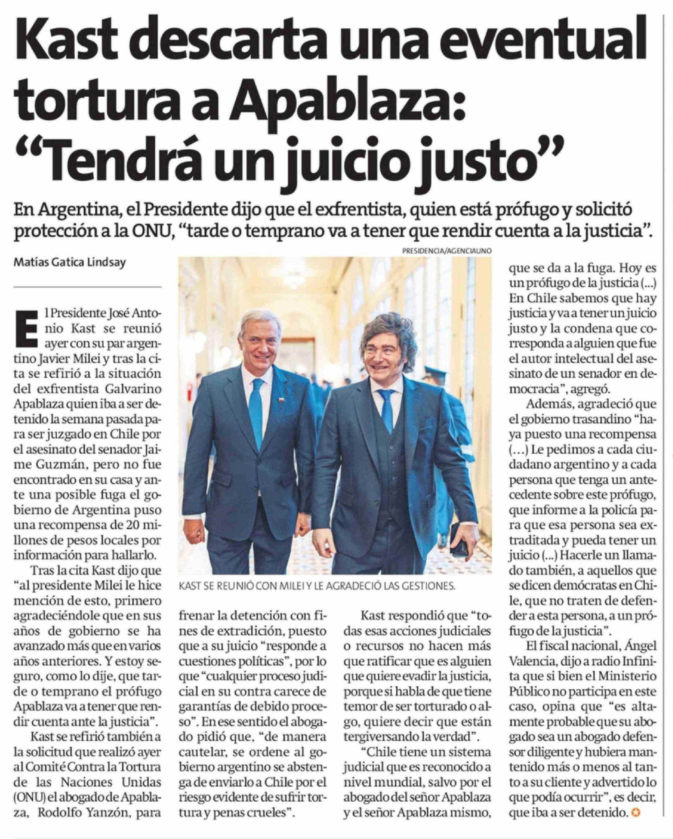 Kast descarta una eventual tortura a Apablaza: "Tendrá un juicio justo"