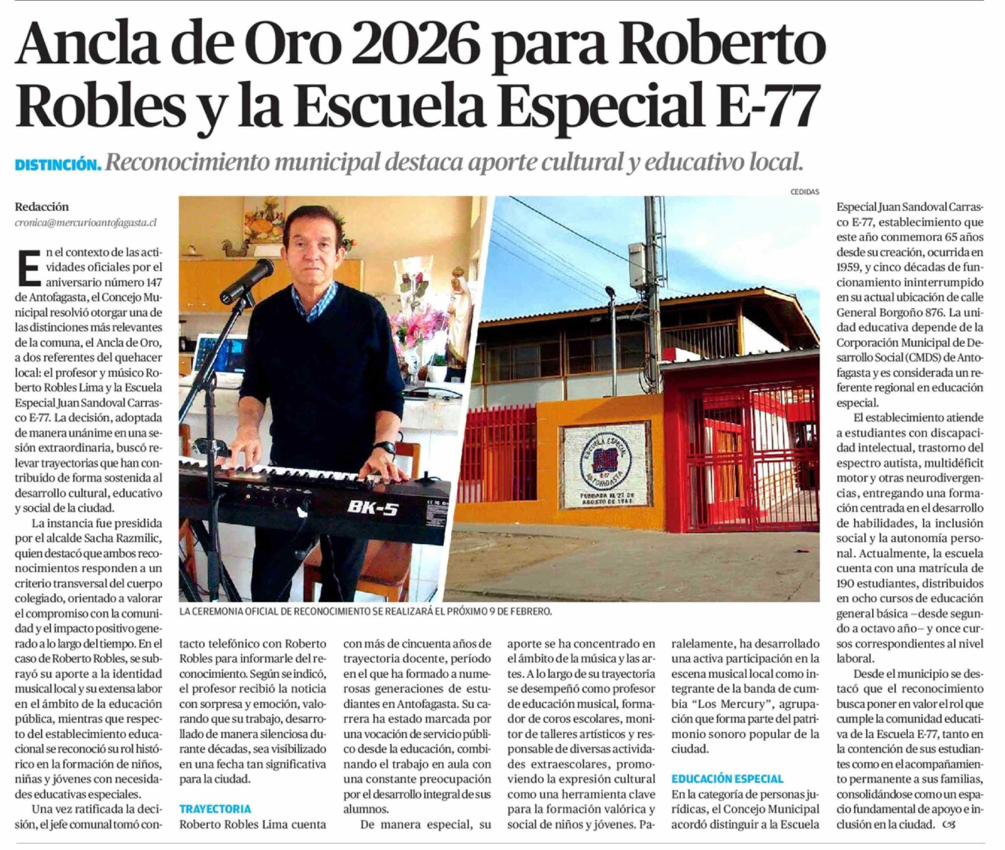 Ancla de Oro 2026 para Roberto Robles y la Escuela Especial E-77