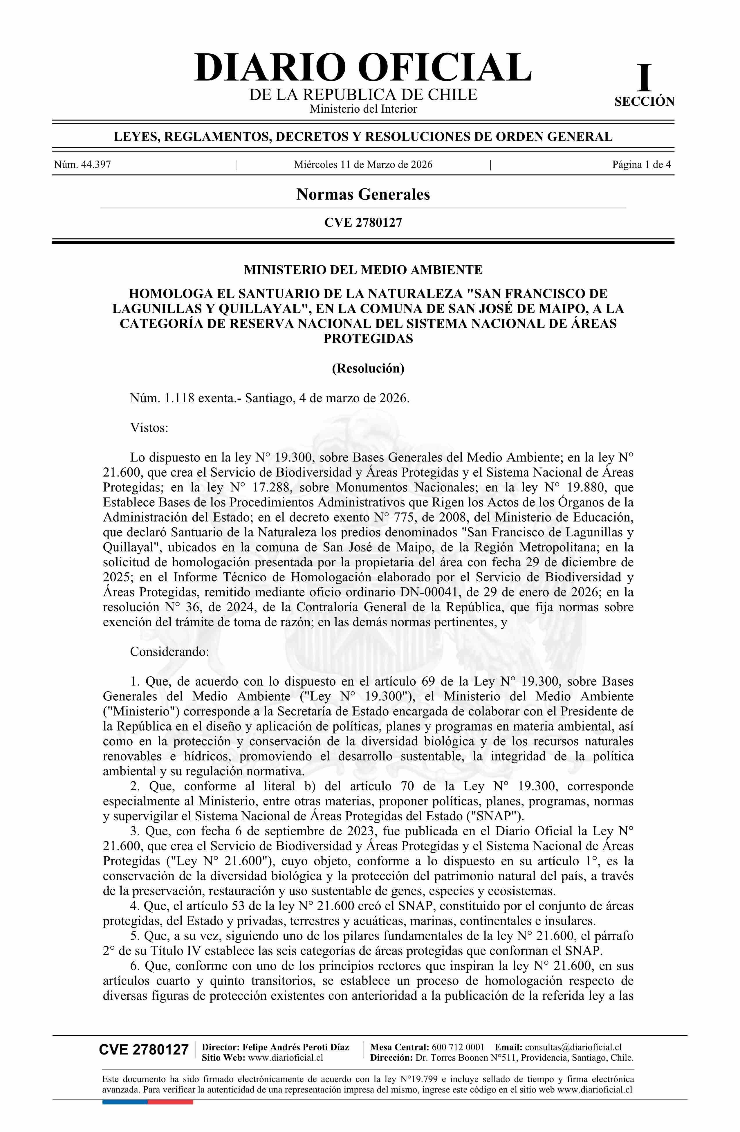 | Título: | Resolución exenta número 1.118, de 2026.- Homologa el Santuario de la Naturaleza San Francisco de Lagunillas y Quillayal, en la comuna de San José de Maipo, a la categoría de Reserva Nacional del Sistema Nacional de Áreas Protegidas |