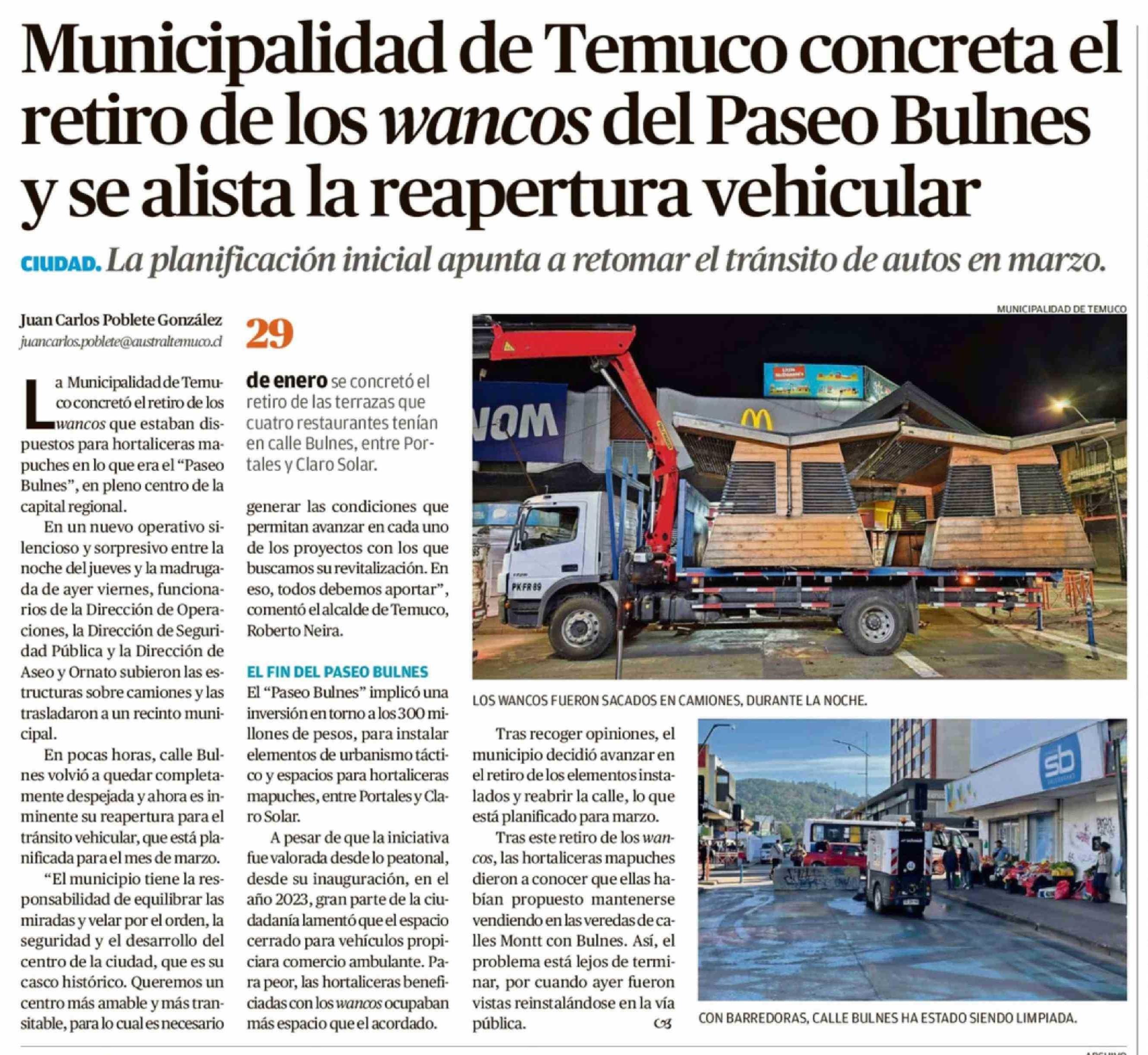 Municipalidad de Temuco concreta el retiro de los wancos del Paseo Bulnes y se alista la reapertura vehicular