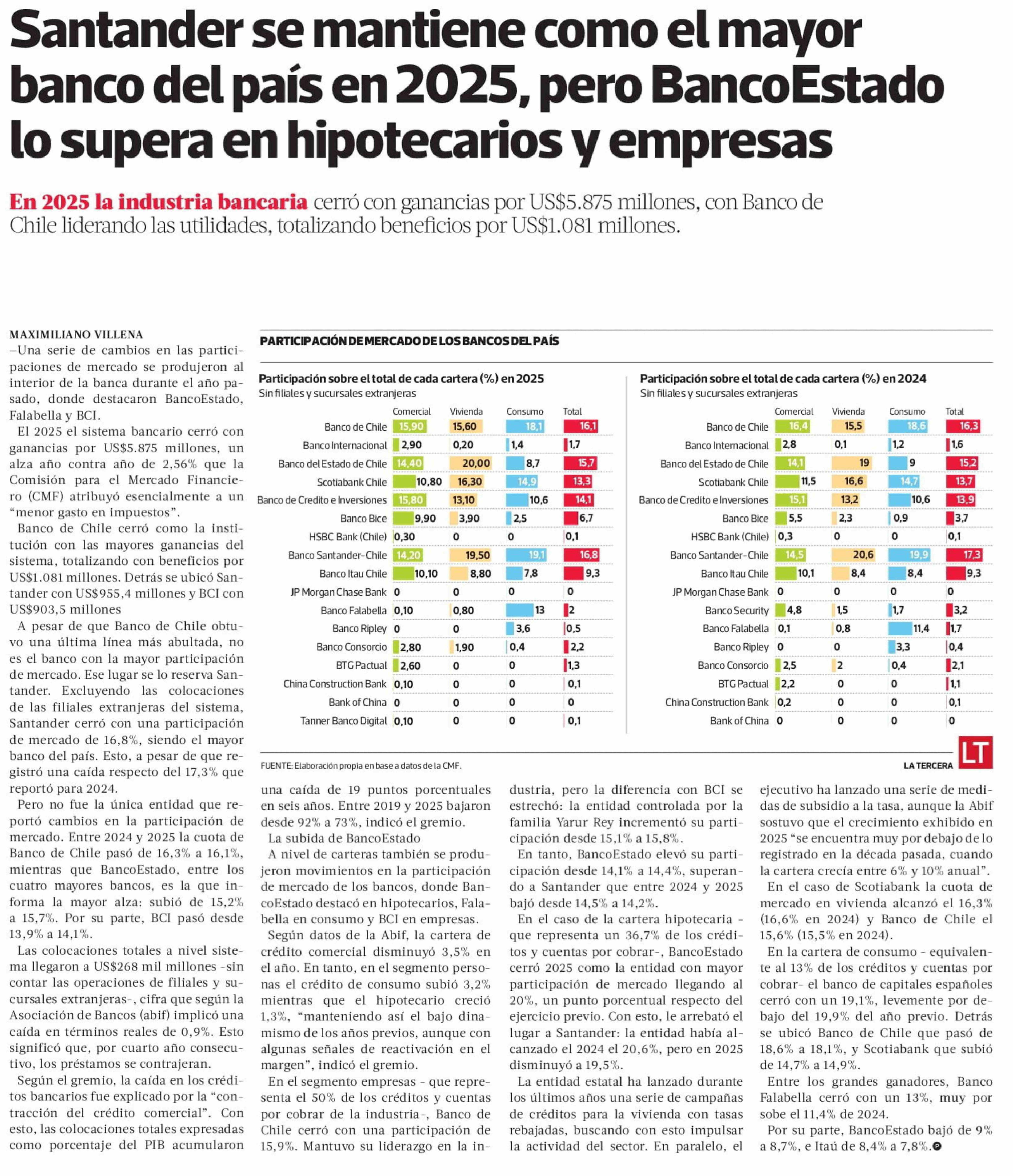Santander se mantiene como el mayor banco del país en 2025, pero BancoEstado lo supera en hipotecarios y empresas