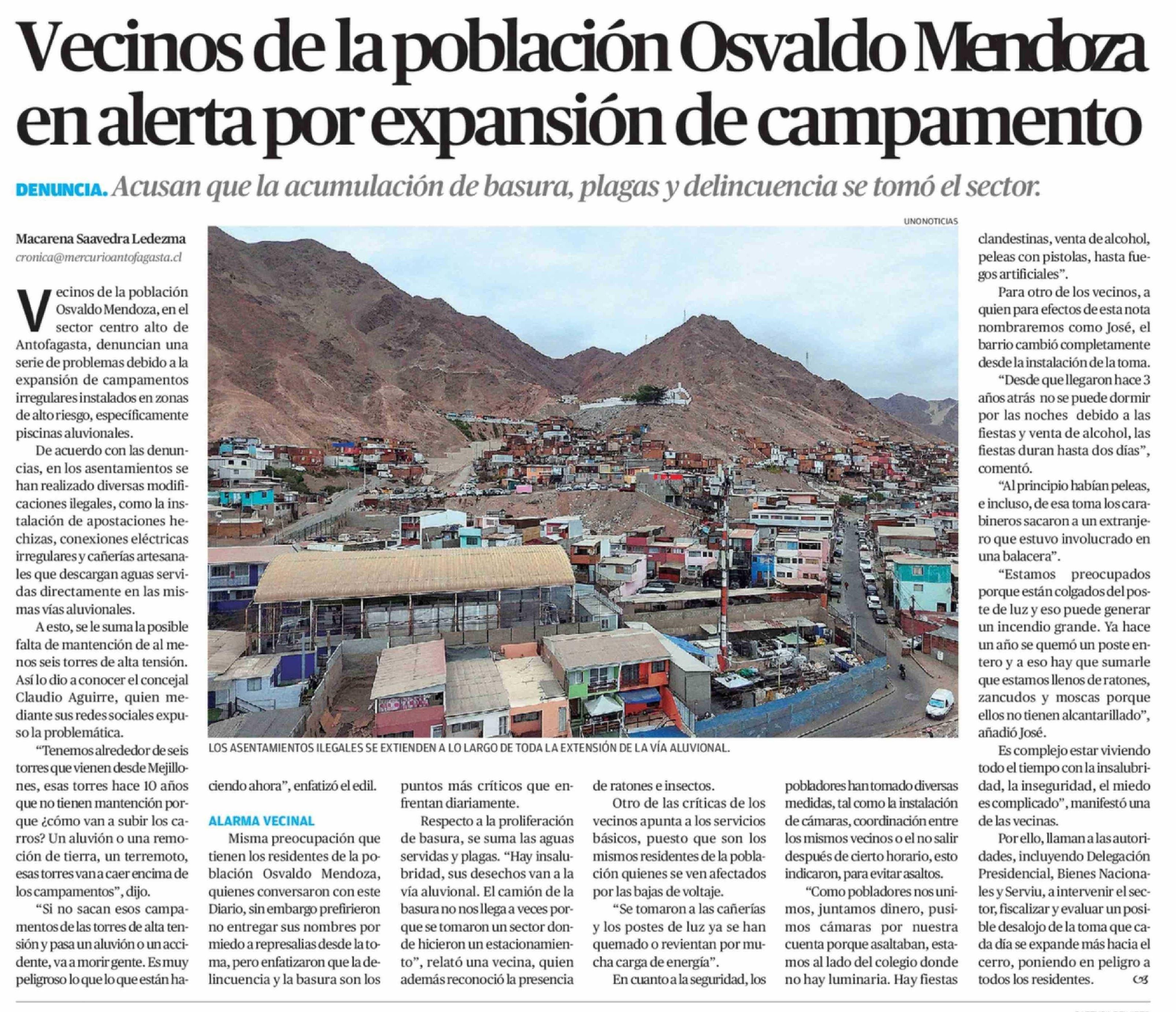 Vecinos de la población Osvaldo Mendoza en alerta por expansión de campamento