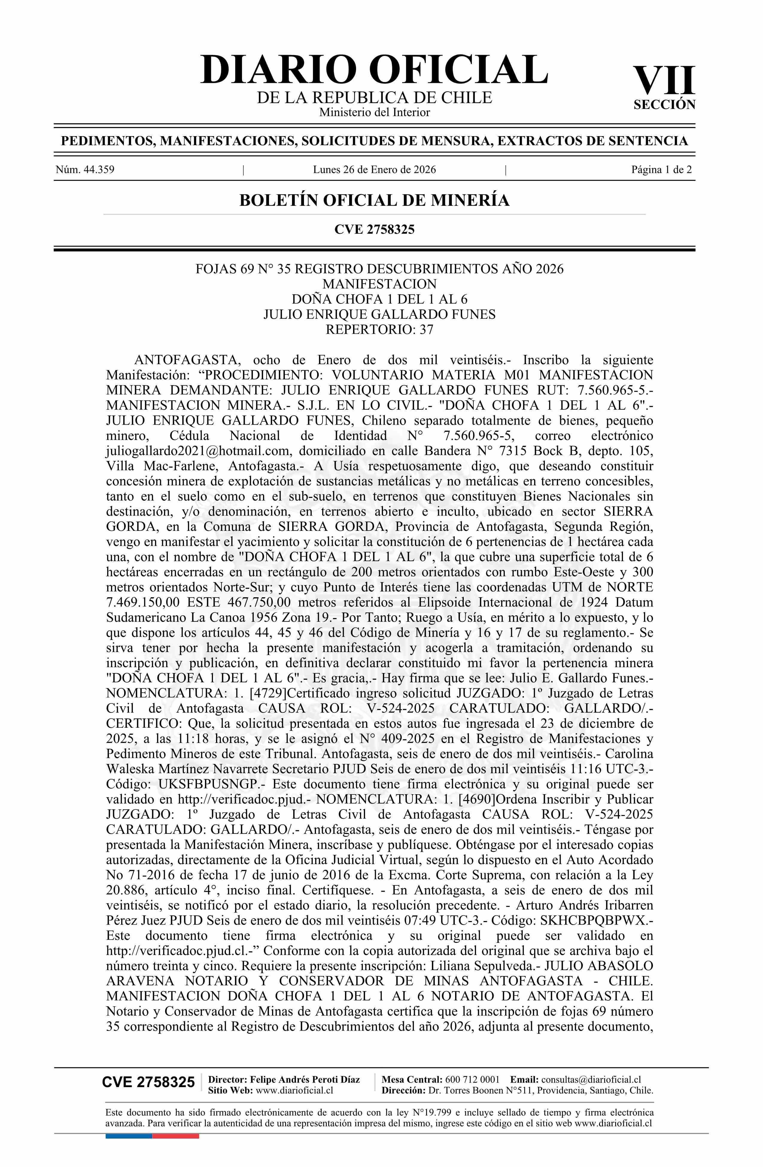 DIARIO OFICIAL CHILE - BOLETÍN OFICIAL DE MINERÍA (DIARIO OFICIAL CHILE – BOM – MANIFESTACIONES MIN)