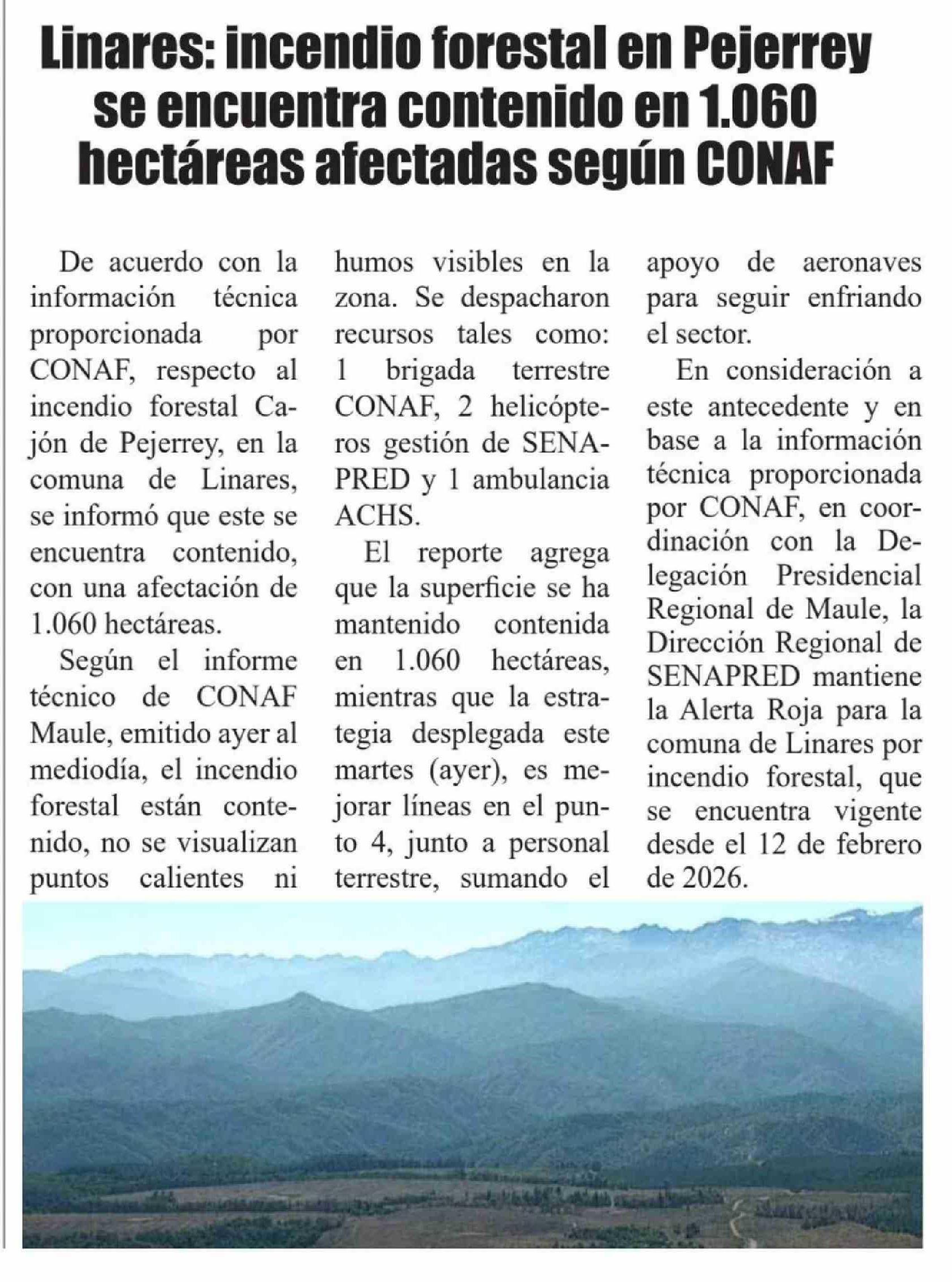 Linares: incendio forestal en Pejerrey se encuentra contenido en 1.060 hectáreas afectadas según CONAF