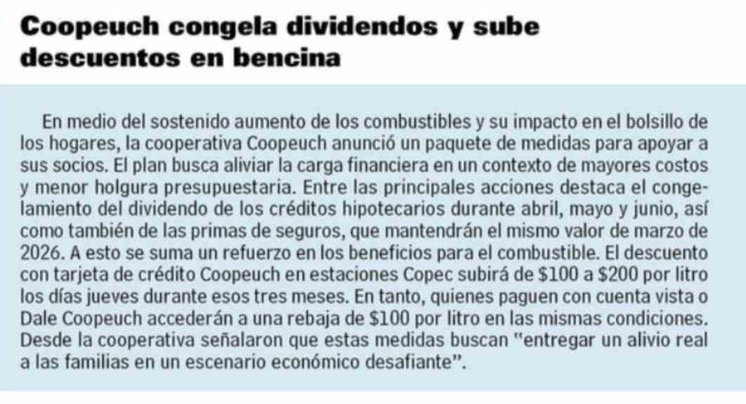 Coopeuch congela dividendos y sube descuentos en bencina