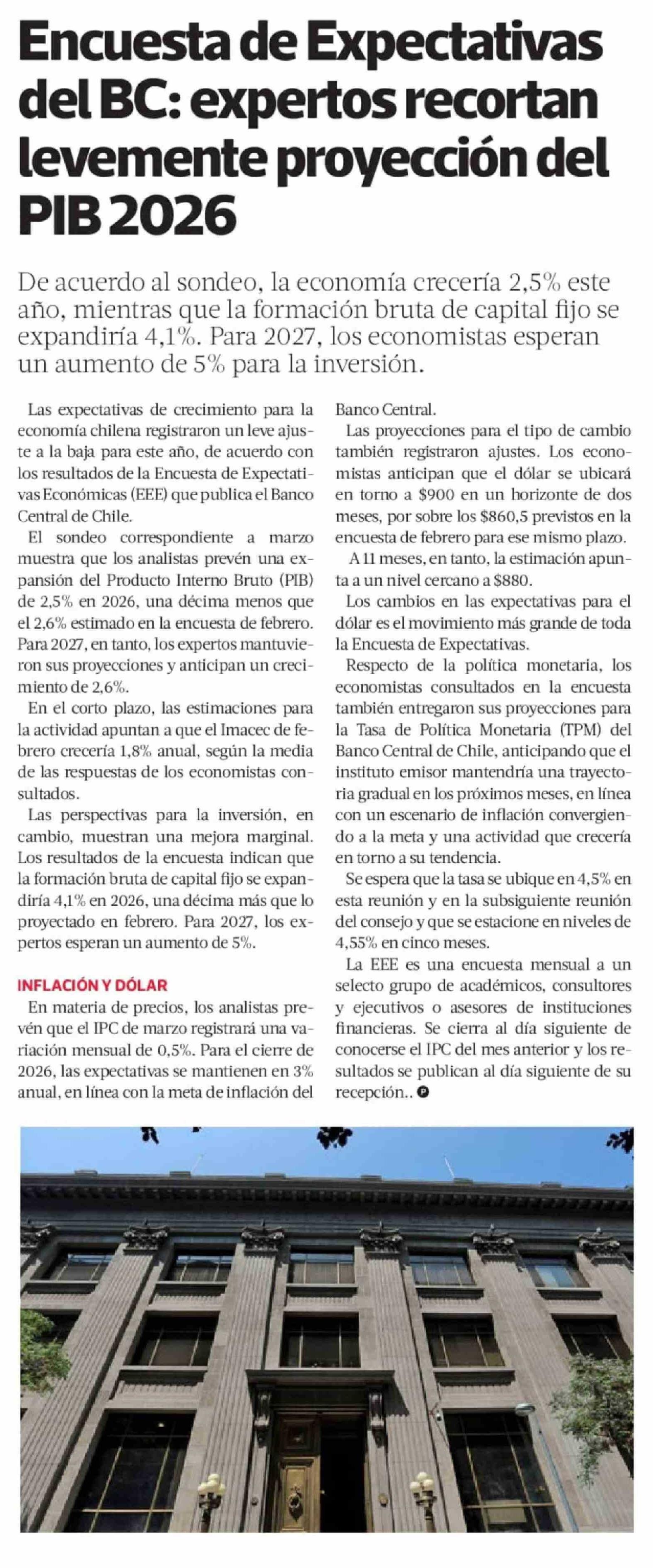 Encuesta de Expectativas del BC: expertos recortan levemente proyección del PIB 2026