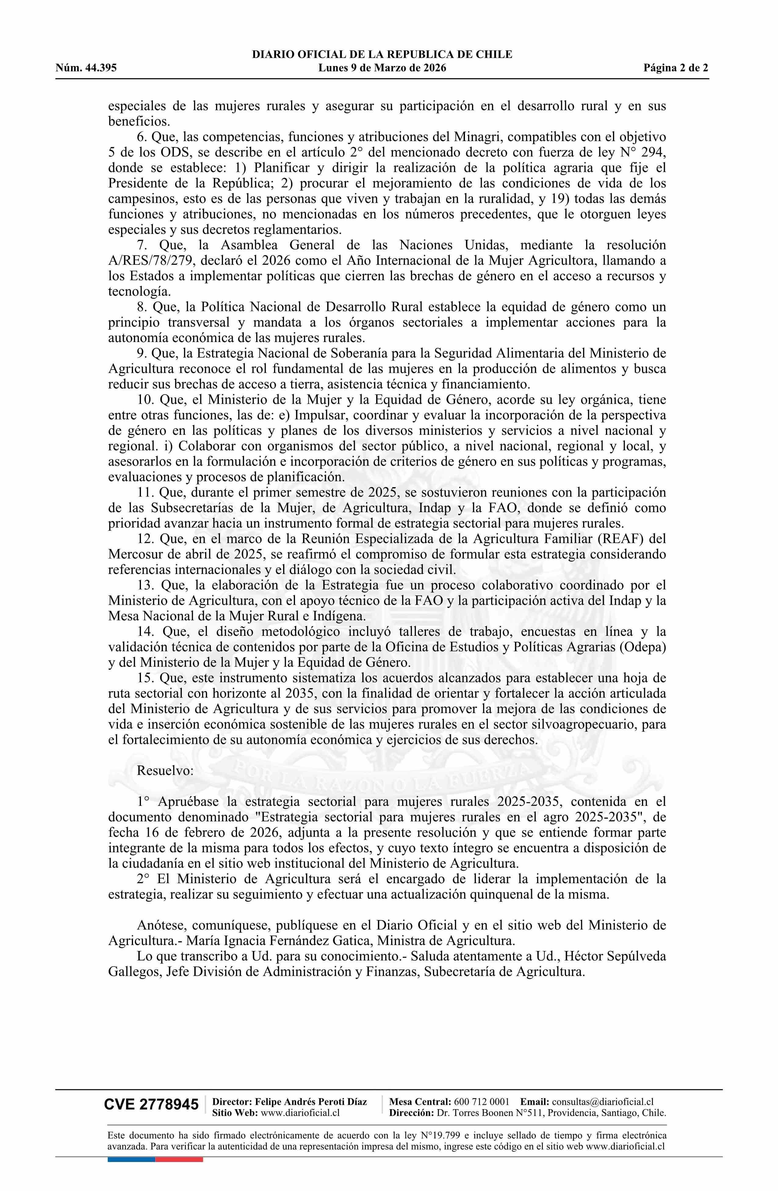 | Título: | Resolución exenta número 165, de 2026.- Aprueba estrategia sectorial para mujeres rurales en el agro 2025 - 2035 |