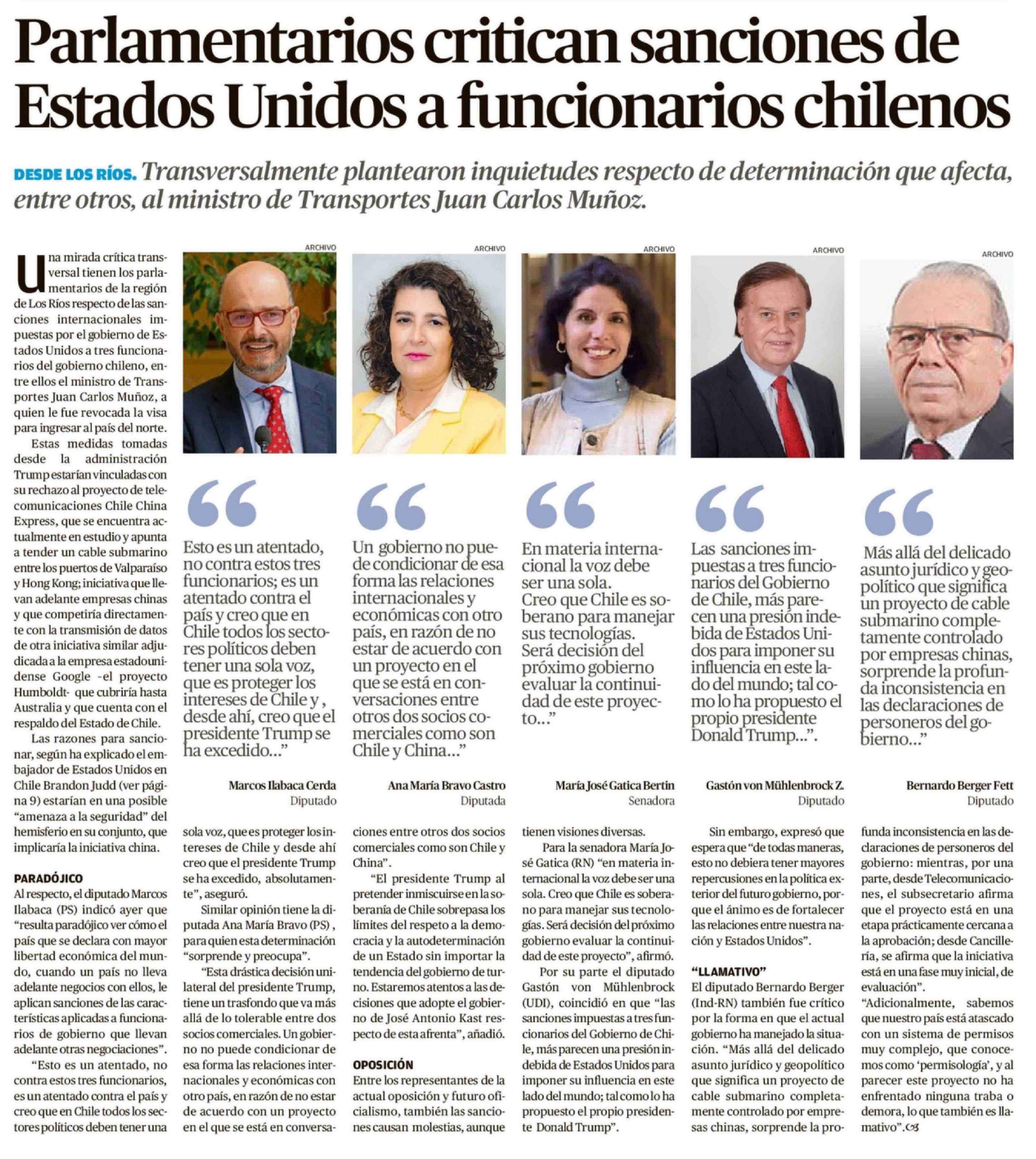 Parlamentarios critican sanciones de Estados Unidos a funcionarios chilenos