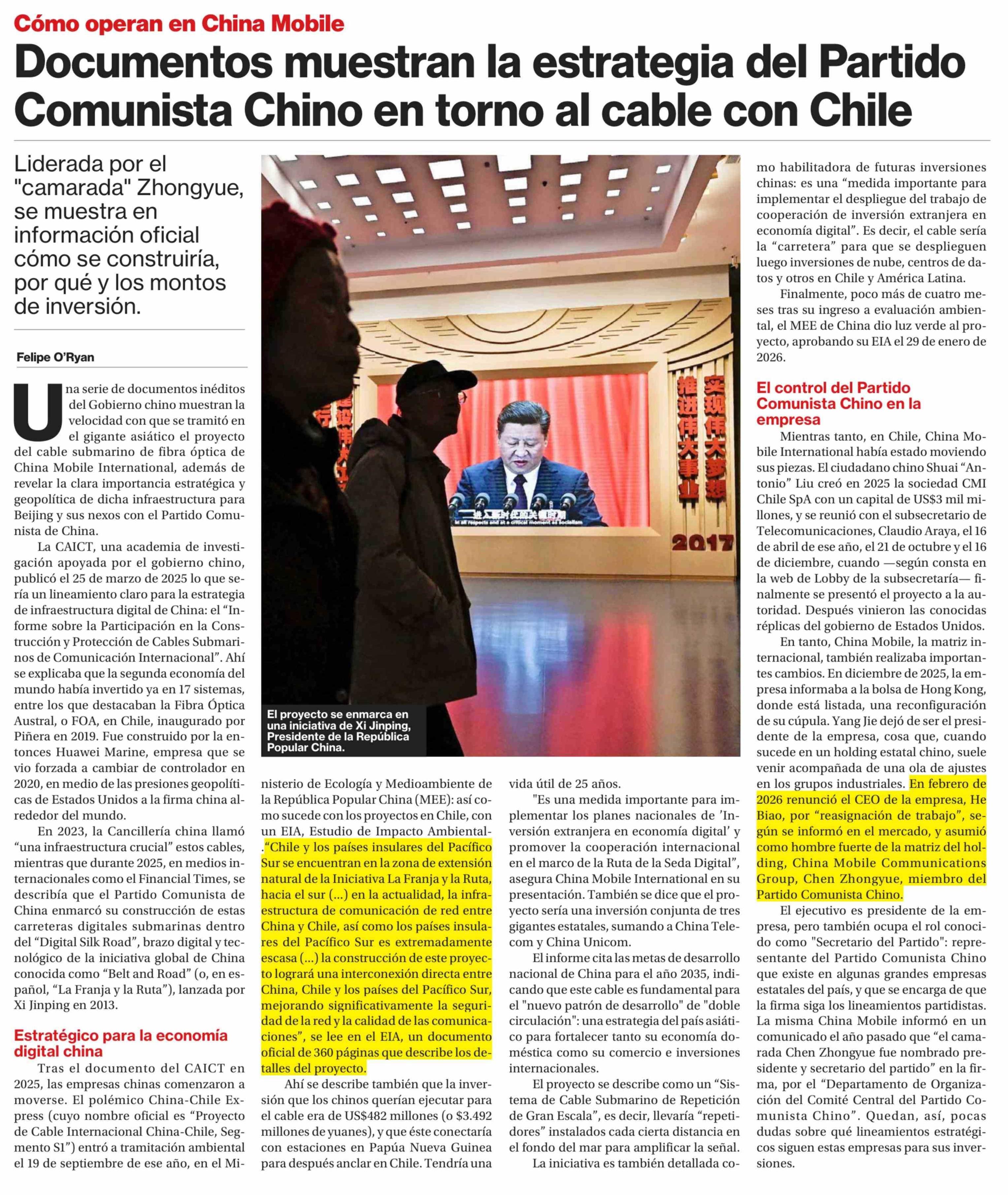 Título: Documentos muestran la estrategia del Partido Comunista Chino en torno al cable con Chile