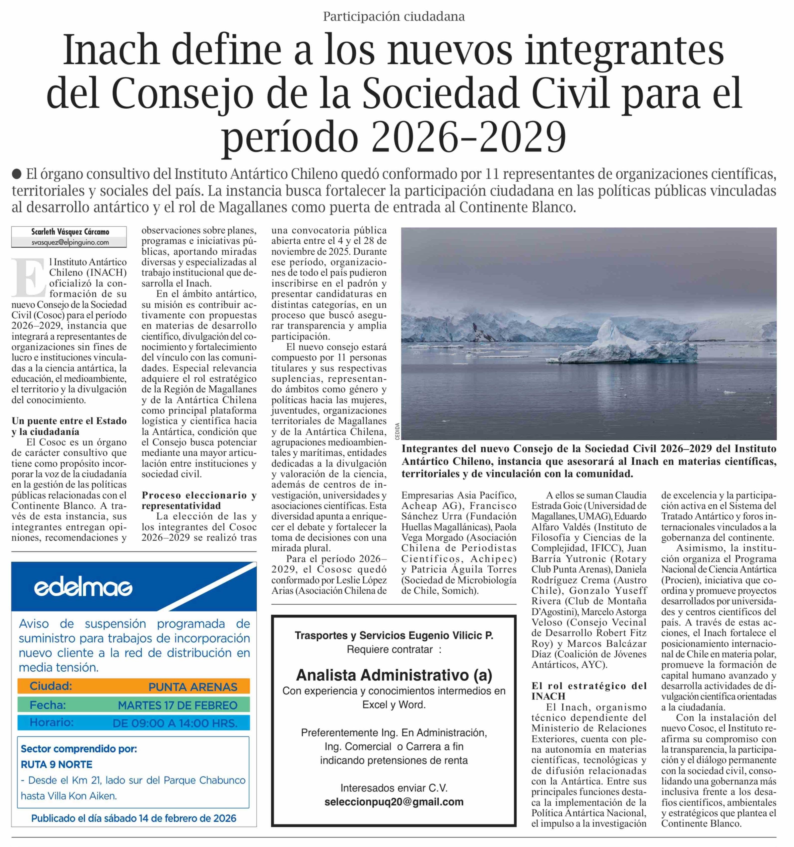 Inach define a los nuevos integrantes del Consejo de la Sociedad Civil para el período 2026-2029
