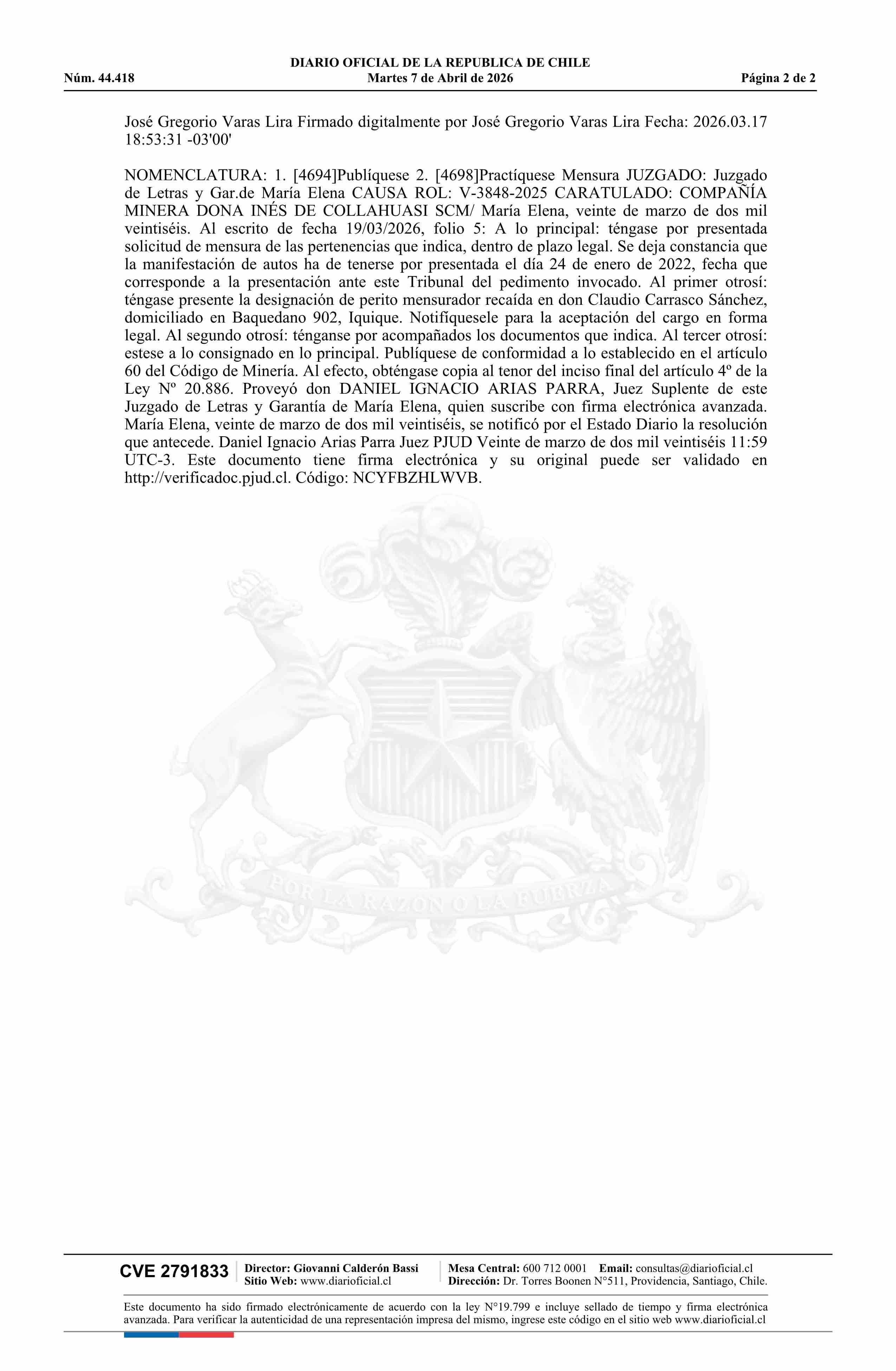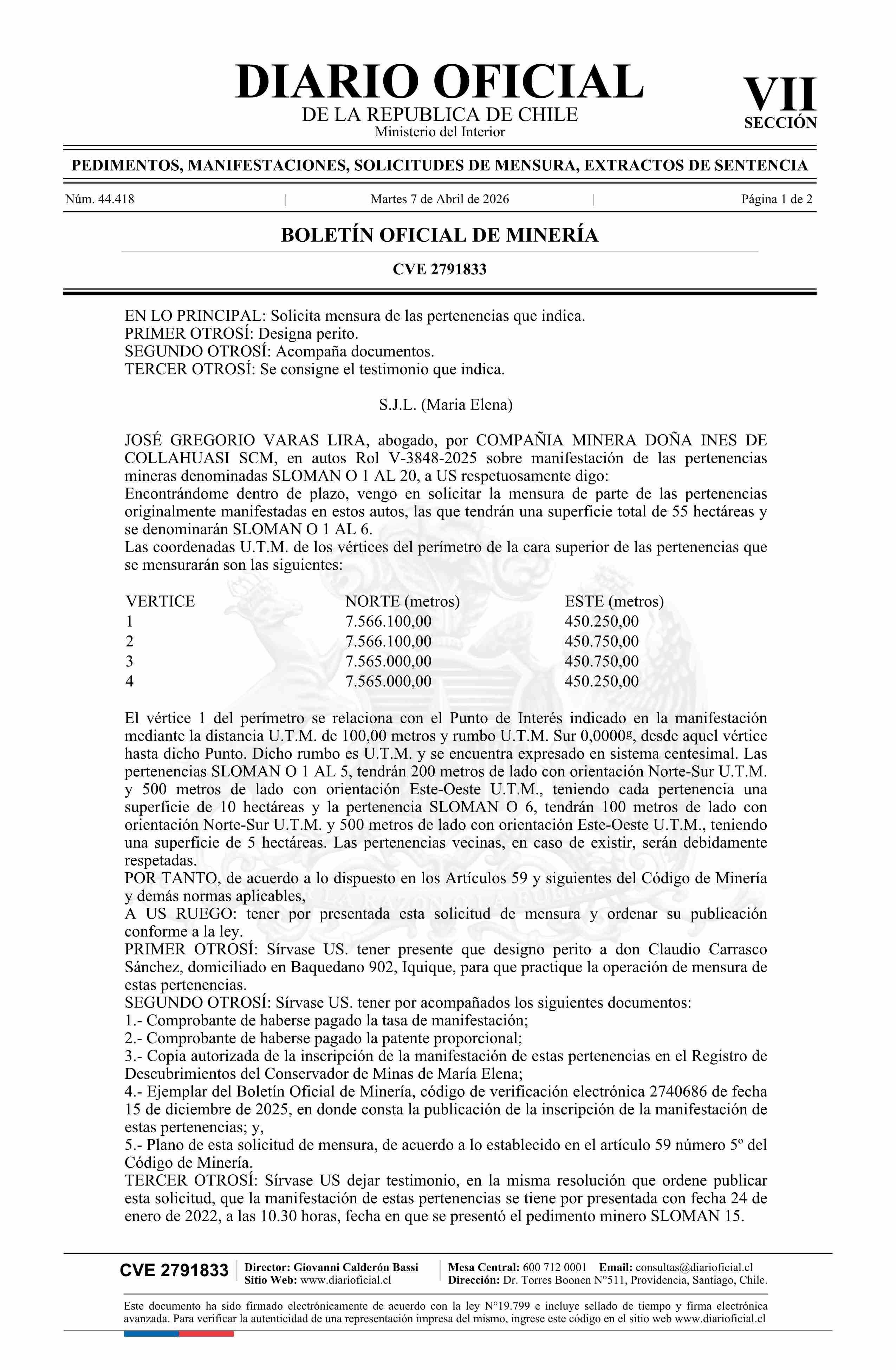 DIARIO OFICIAL CHILE - BOLETÍN OFICIAL DE MINERÍA (DIARIO OFICIAL CHILE – BOM – SOLICITUDES DE MENSUR)