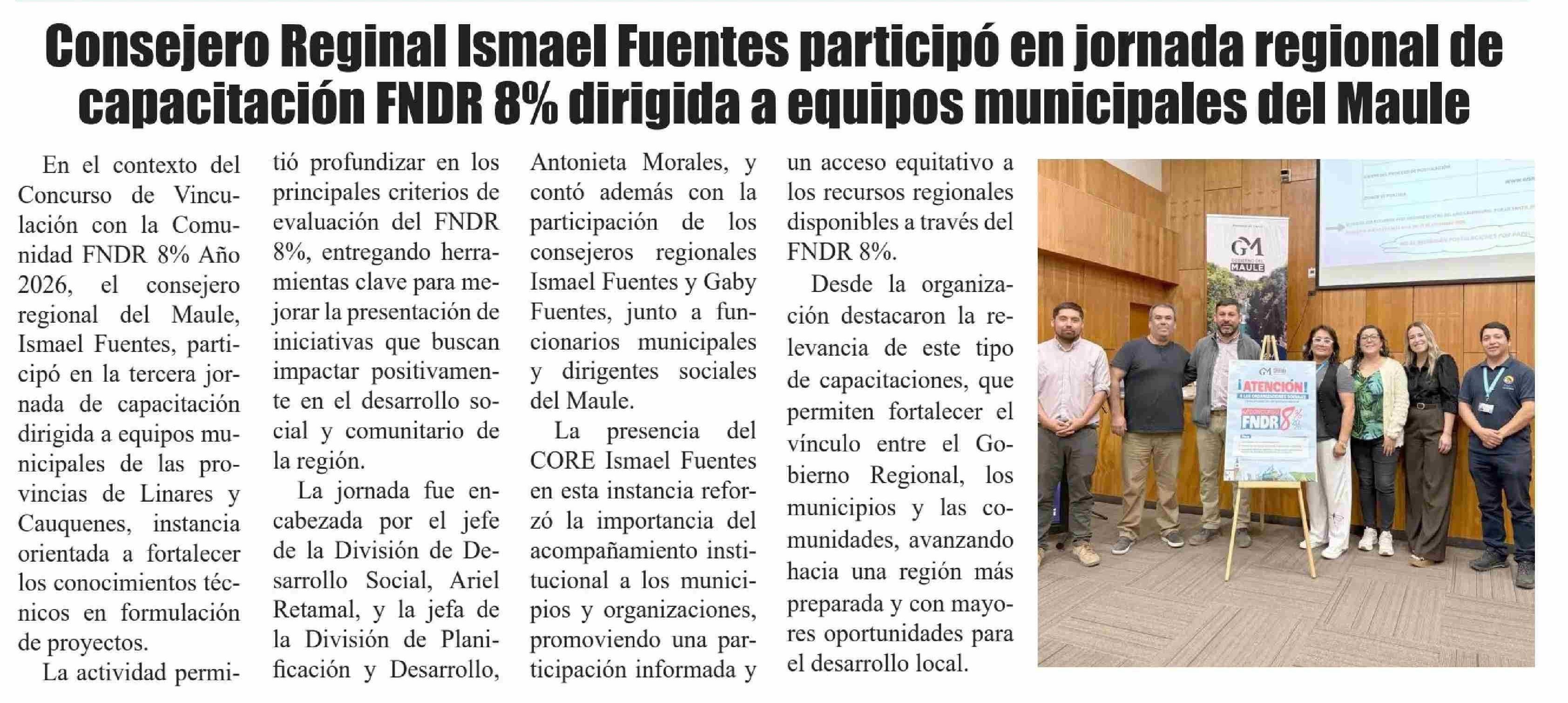 Consejero Reginal Ismael Fuentes participó en jornada regional de capacitación FNDR 8% dirigida a equipos municipales del Maule