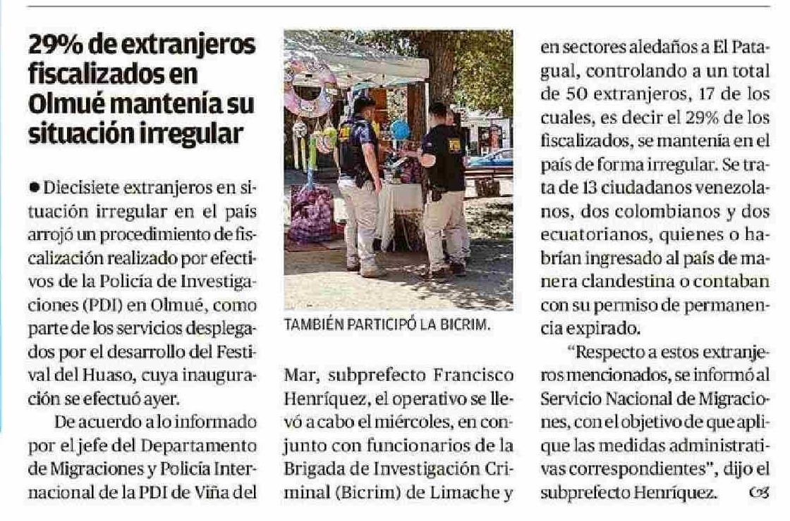 29% De extranjeros fiscalizados en Olmué mantenía su situación irregular