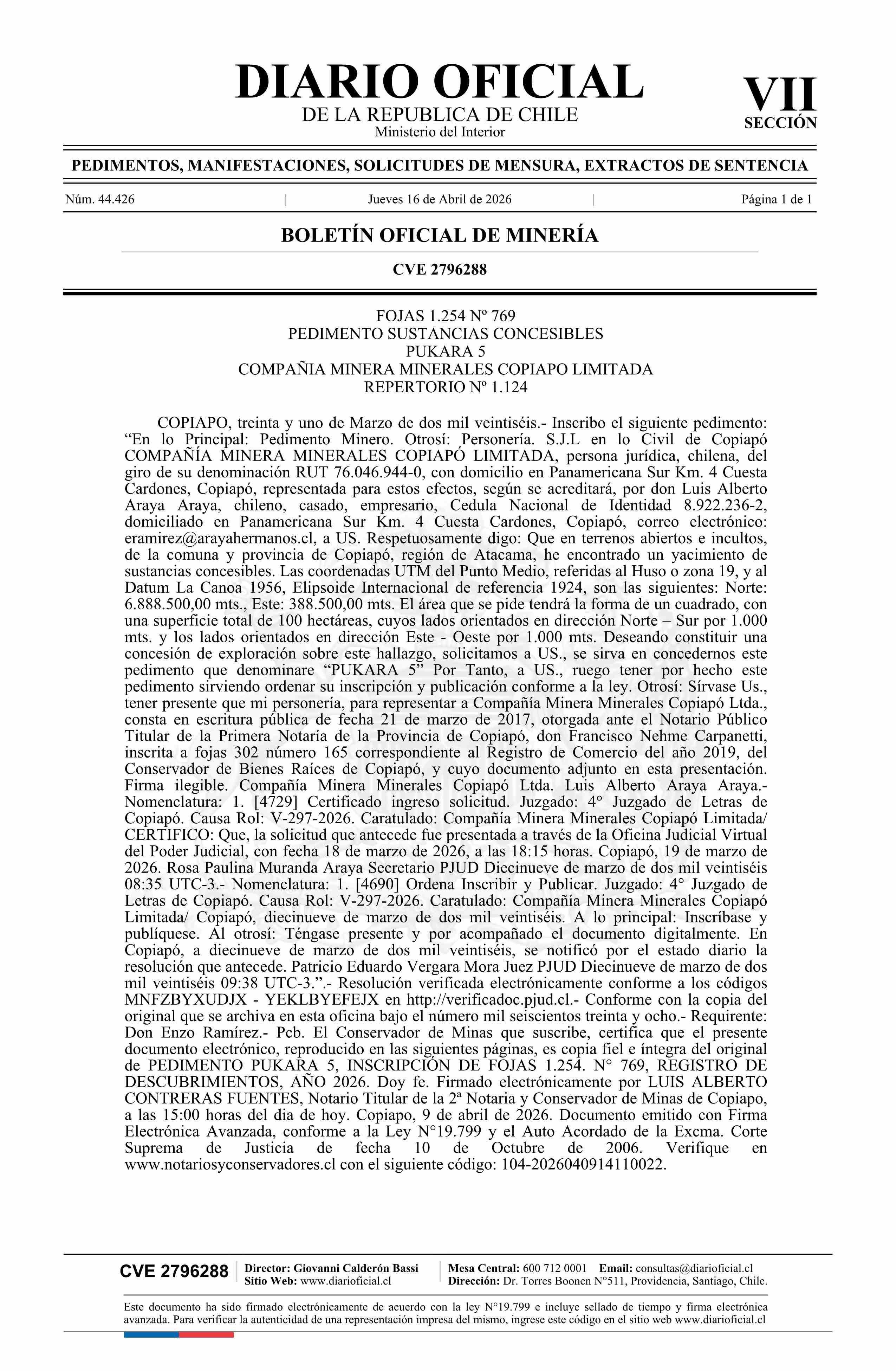 DIARIO OFICIAL CHILE - BOLETÍN OFICIAL DE MINERÍA (DIARIO OFICIAL CHILE – BOM – PEDIMENTOS MINEROS)