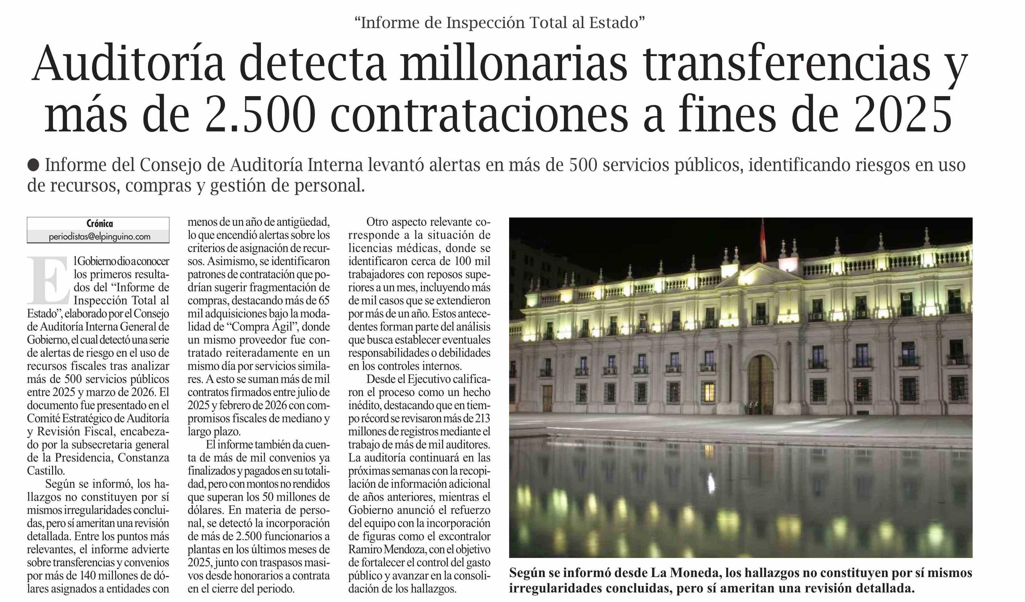 Auditoría detecta millonarias transferencias más de 2.500 contrataciones a fines de 2025
