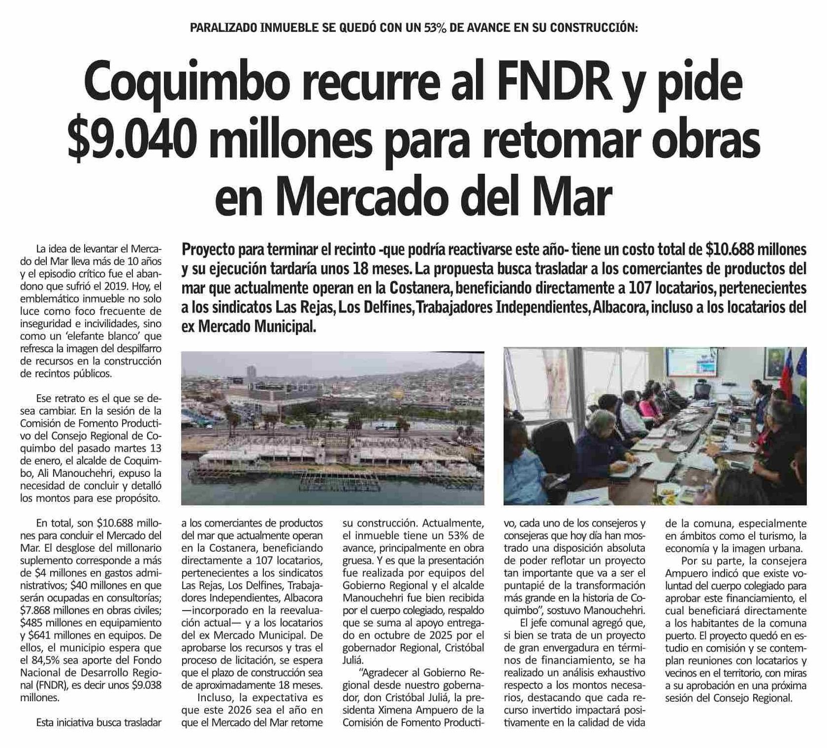 Coquimbo recurre al FNDR y pide $9.040 millones para retomar obras en Mercado del Mar
