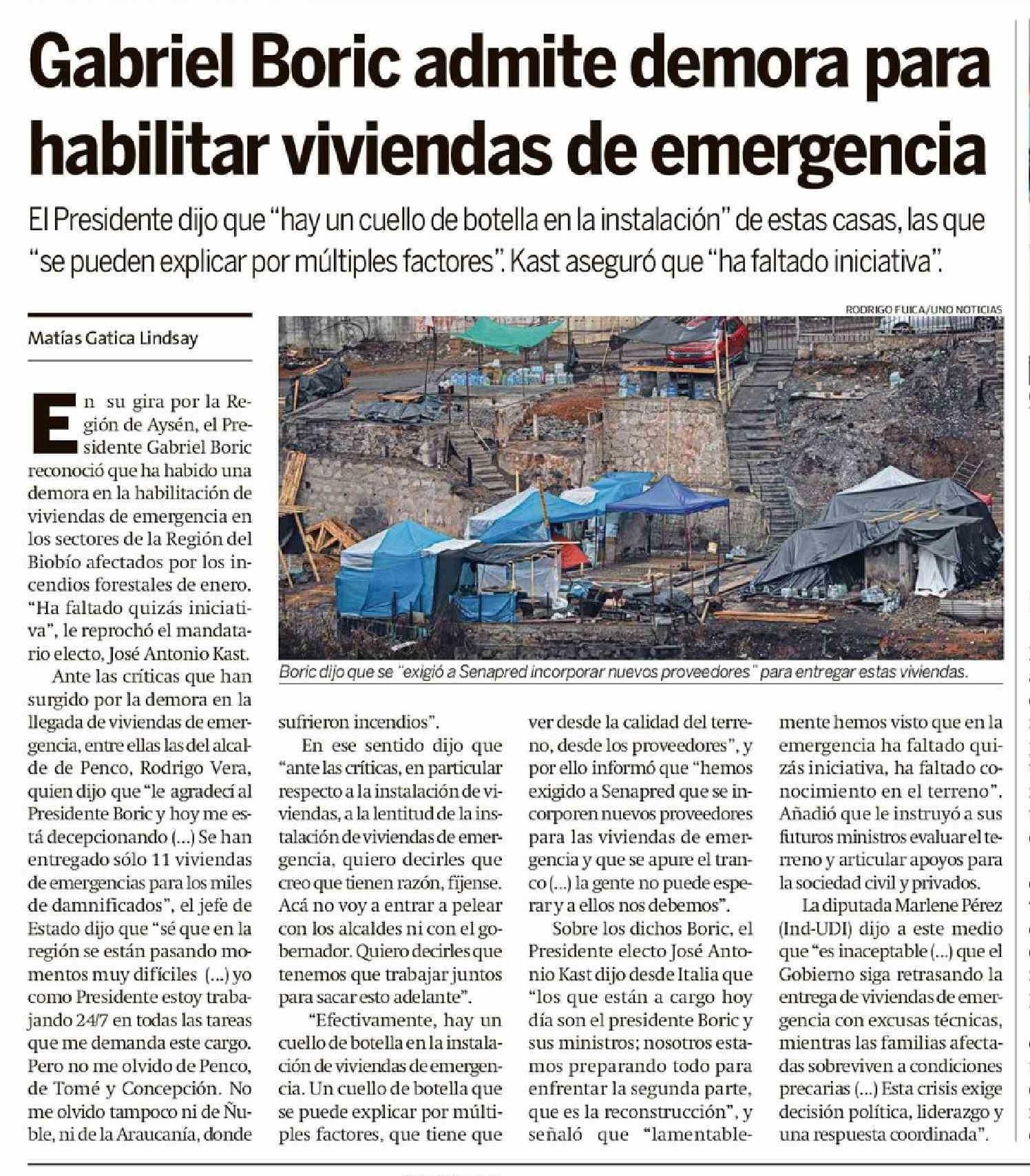Gabriel Boric admite demora para habilitar viviendas de emergencia