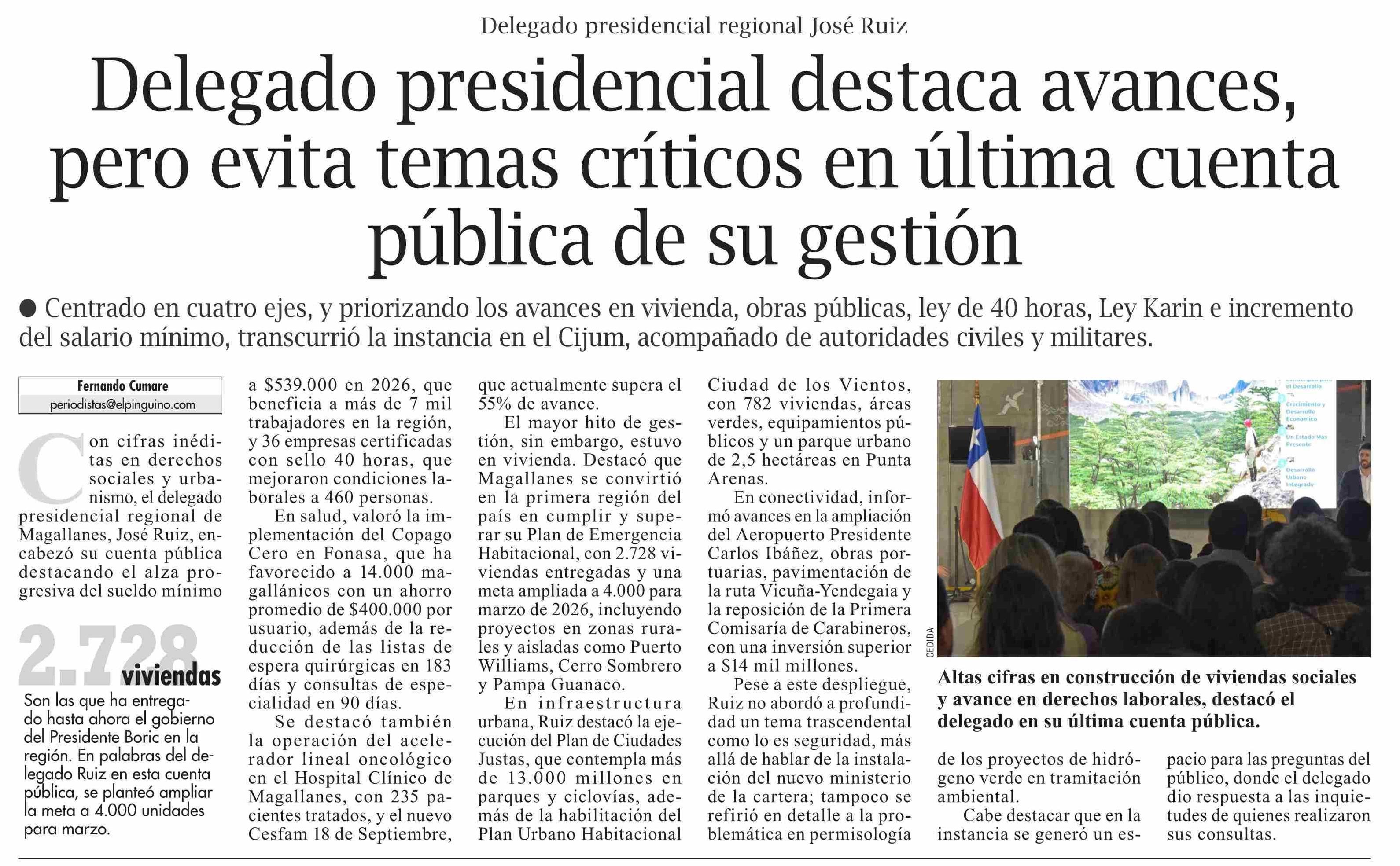 Delegado presidencial destaca avances, pero evita temas críticos en última cuenta pública de su gestión
