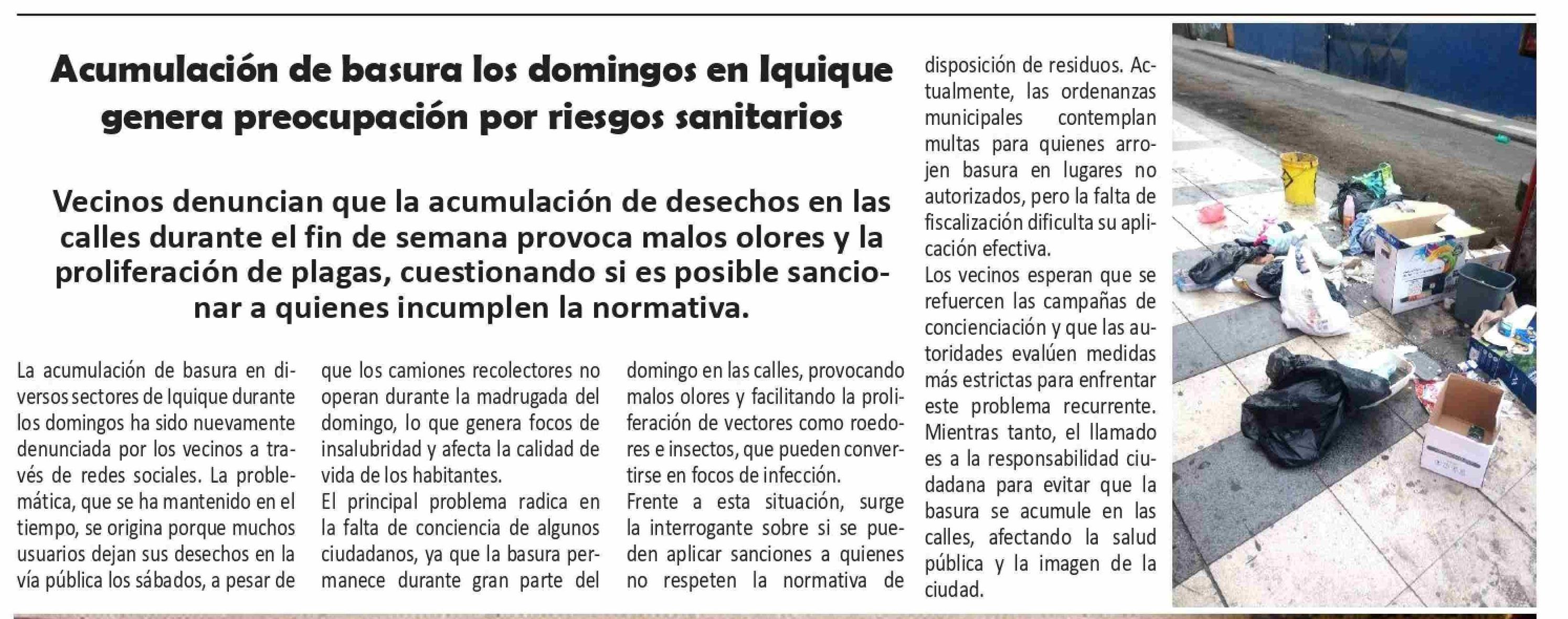 Título: La acumulación de basura en diversos sectores de Iquique durante los domingos ha sido nuevamente denunciada por los vecinos a través de redes sociales. La problemática, que se ha mantenido en el tiempo, se origina porque muchos usuarios dejan sus desechos en la vía pública los sábados, a pesar de