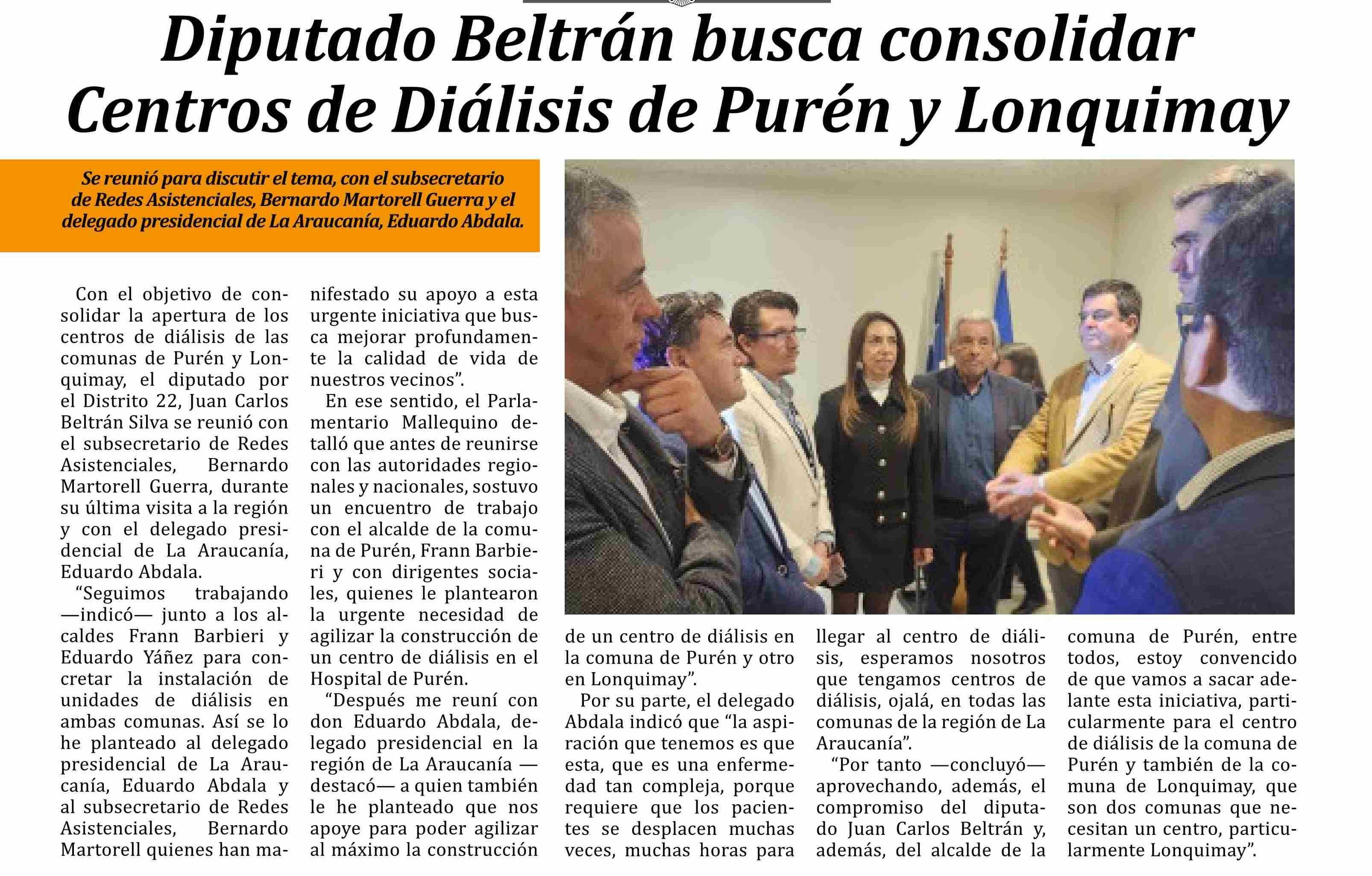 Diputado Beltrán busca consolidar Centros de Diálisis de Purén y Lonquimay