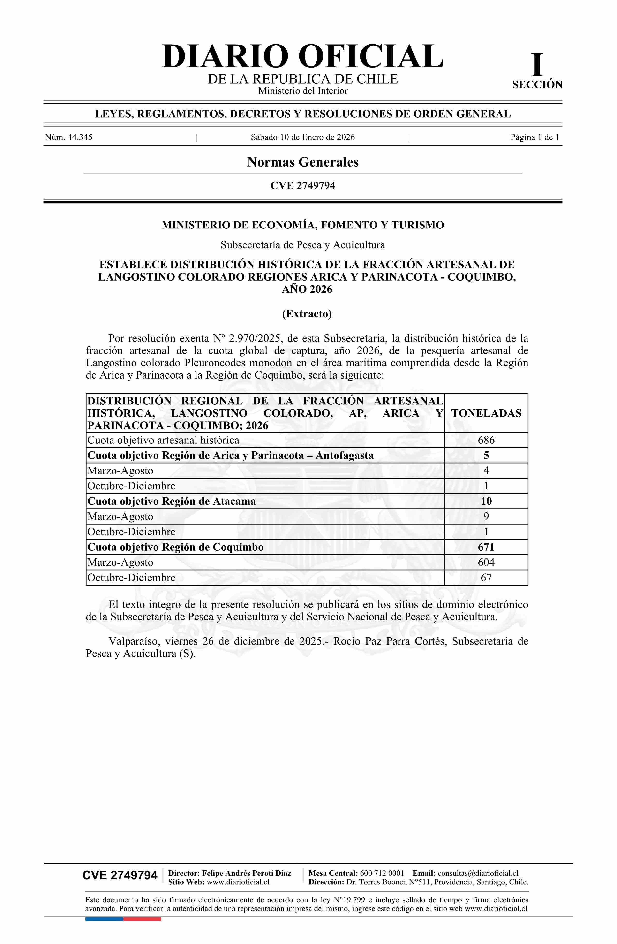 | Título: | Extracto de resolución exenta número 2.970, de 2025.- Establece distribución histórica de la fracción artesanal de Langostino colorado regiones Arica y Parinacota - Coquimbo, año 2026 |